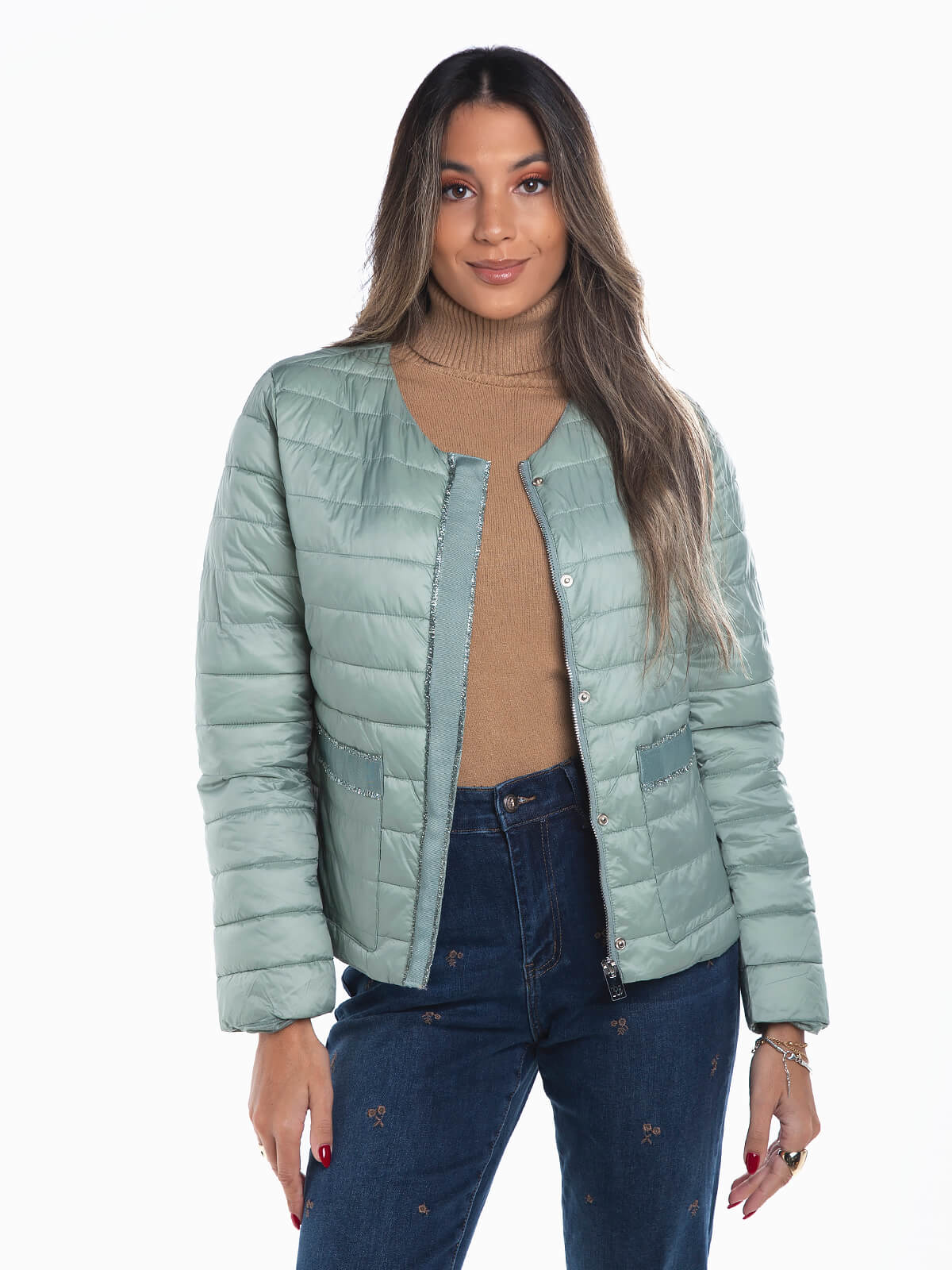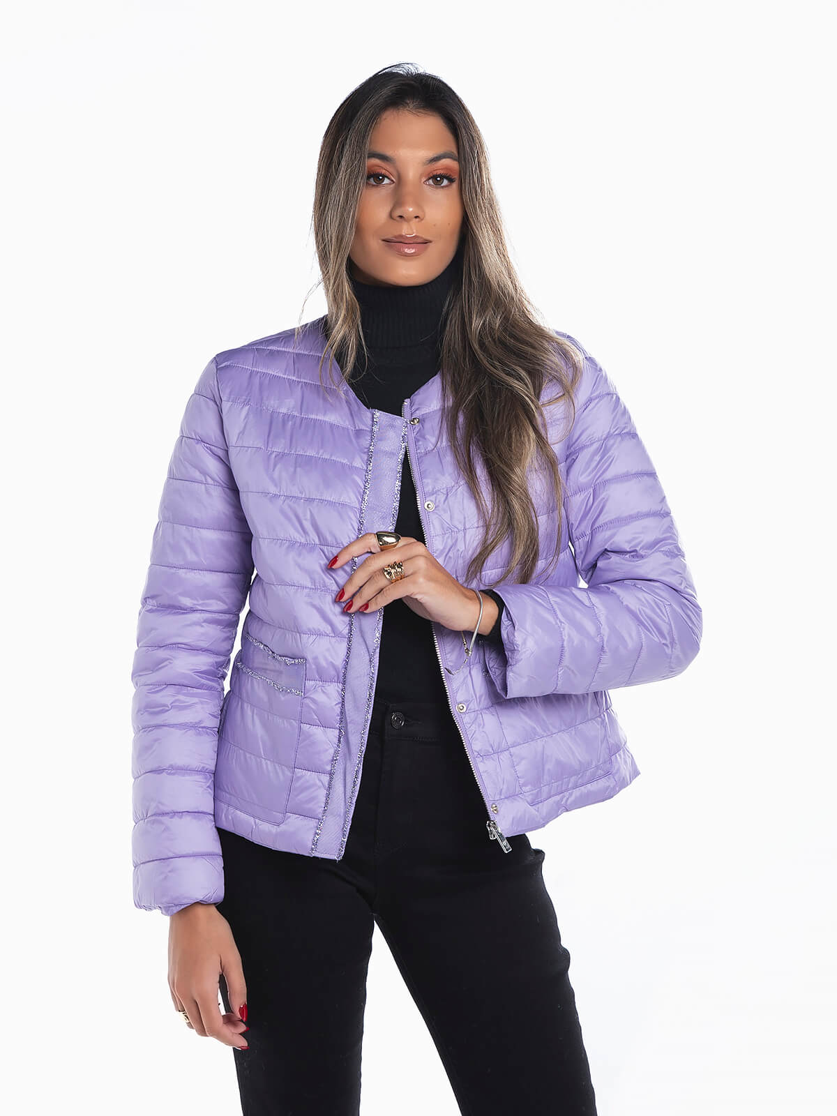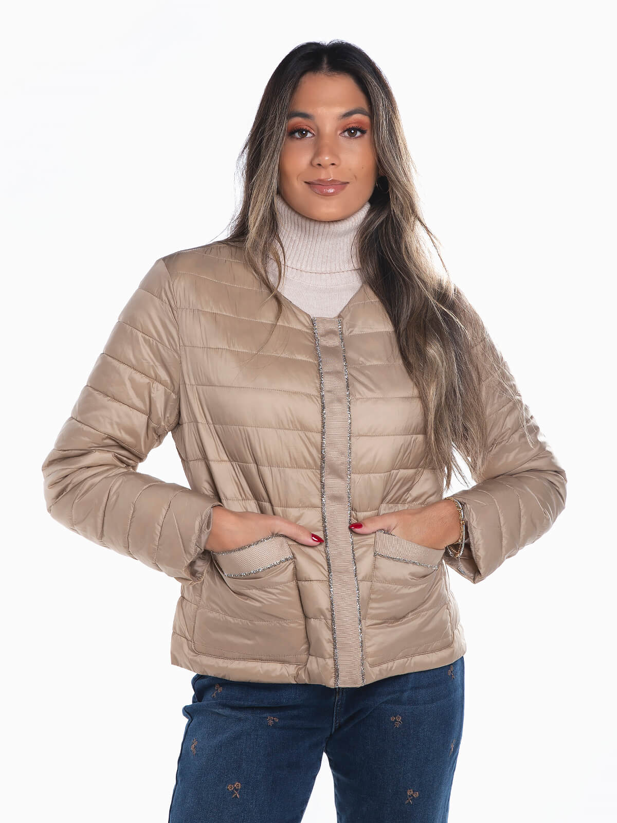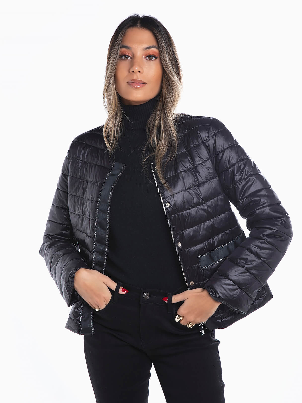 Blusão impermeável com detalhes brilhantes para senhora. Blusão com acolchoado leve e manga comprida. 2 bolsos. Aperto de fecho zíper e botões pressão.
