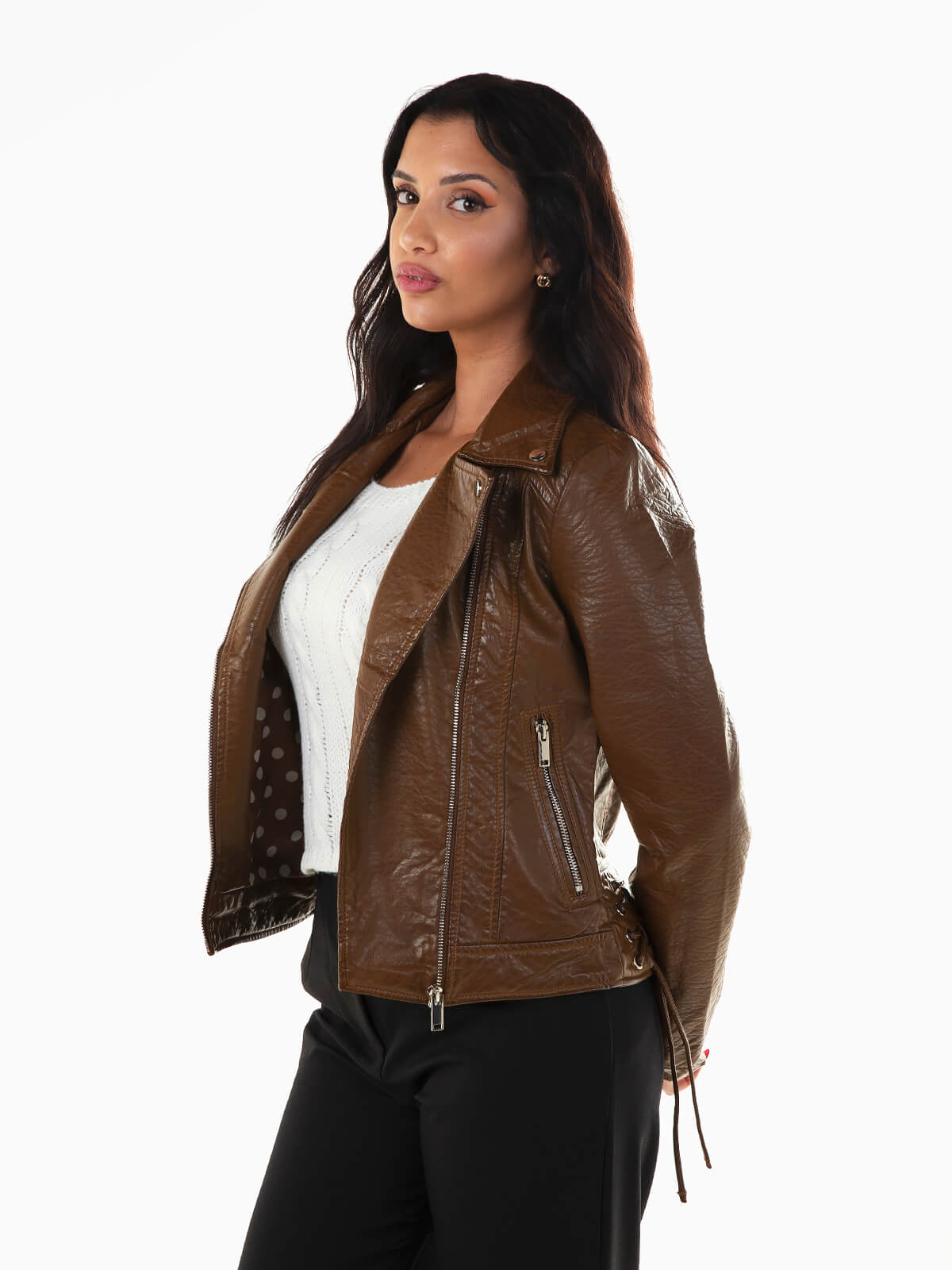 Blusão motard camel para senhora. Blusão efeito pele com gola de lapelas e 2 bolsos. Manga comprida. Interior com forro às bolas. Cordões laterais para ajustar. Fecho éclair em viés na frente.