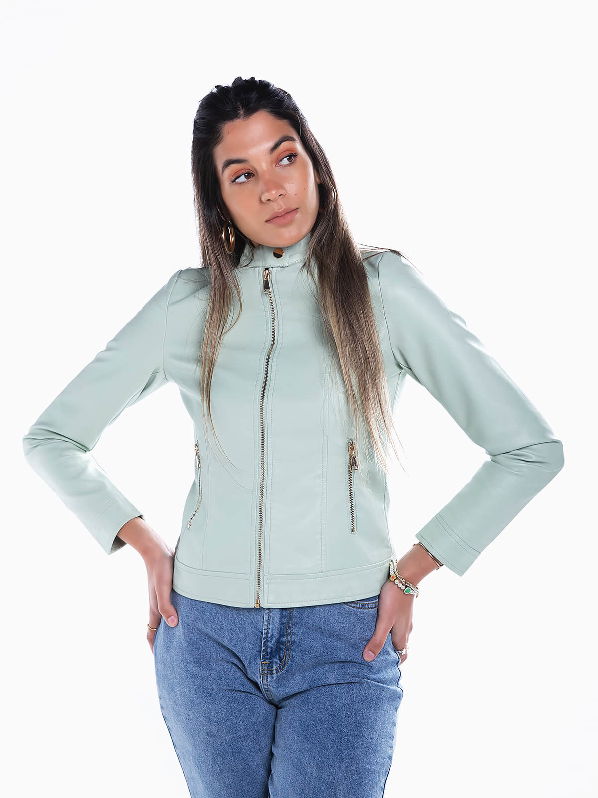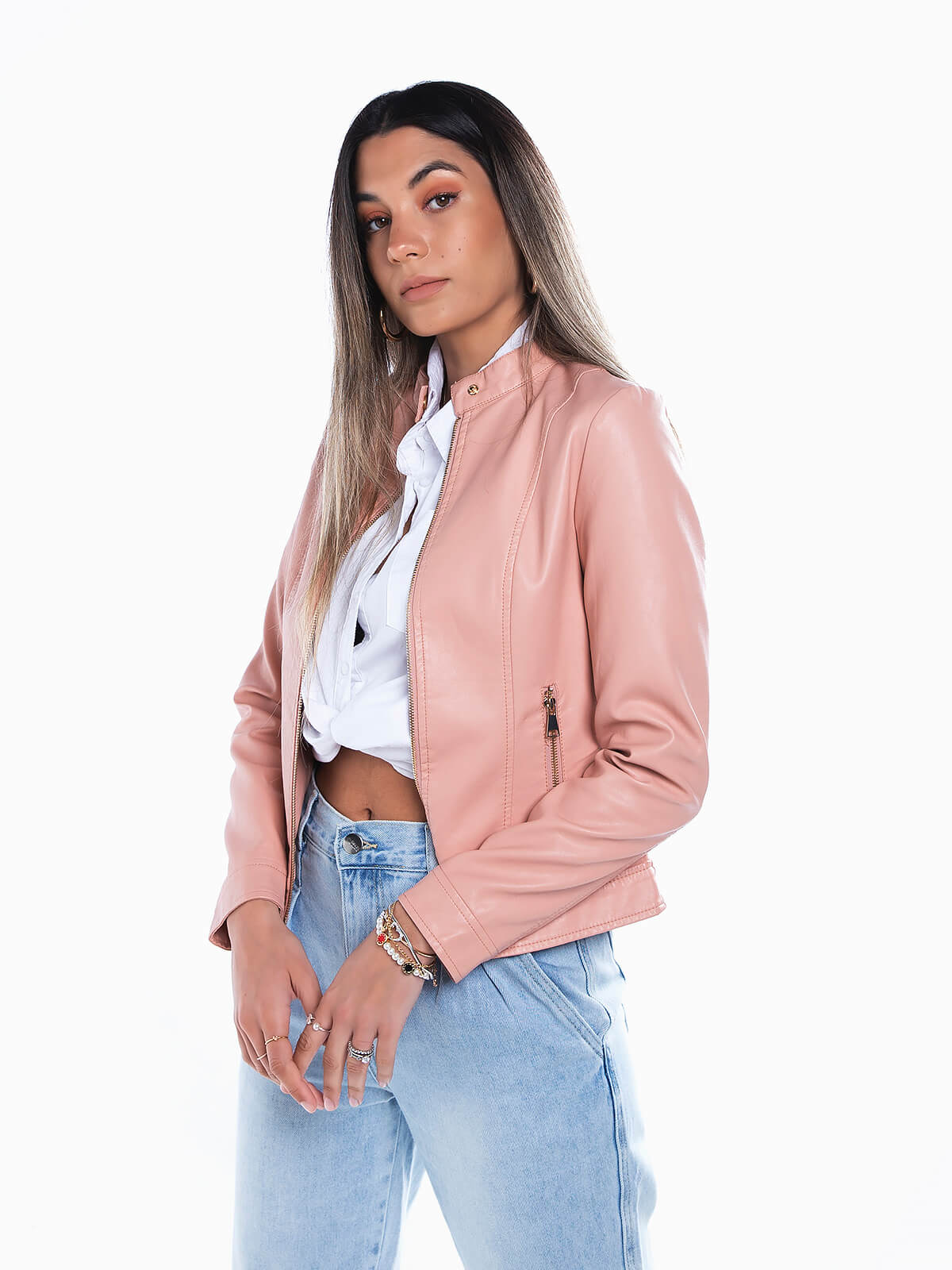 Blusão motard cintado para senhora. Forrado. Gola redonda com tira e mola de pressão. Aperto com fecho zíper. Bolsos de lado.