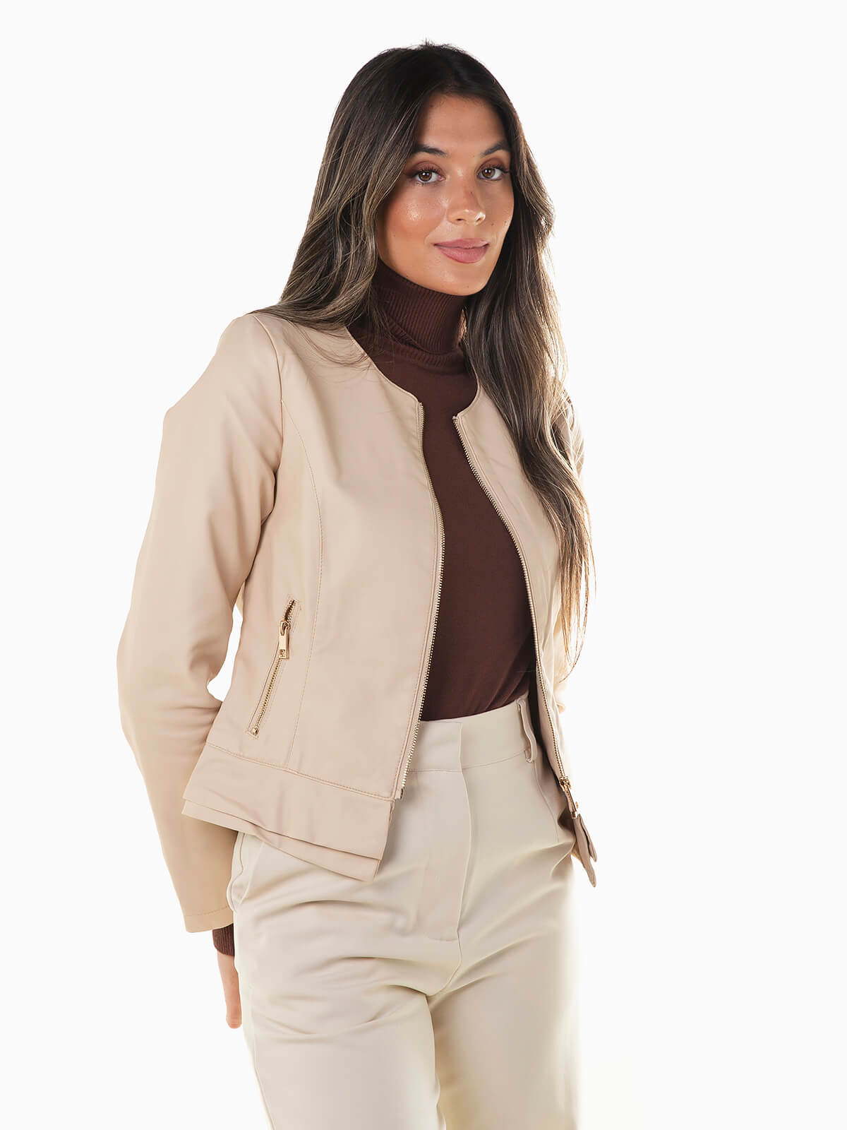 Blusão motard com folho na base. Casaco biker manga comprida com interior forrado e 2 bolsos. Decote redondo e aperto frontal de fecho zíper.