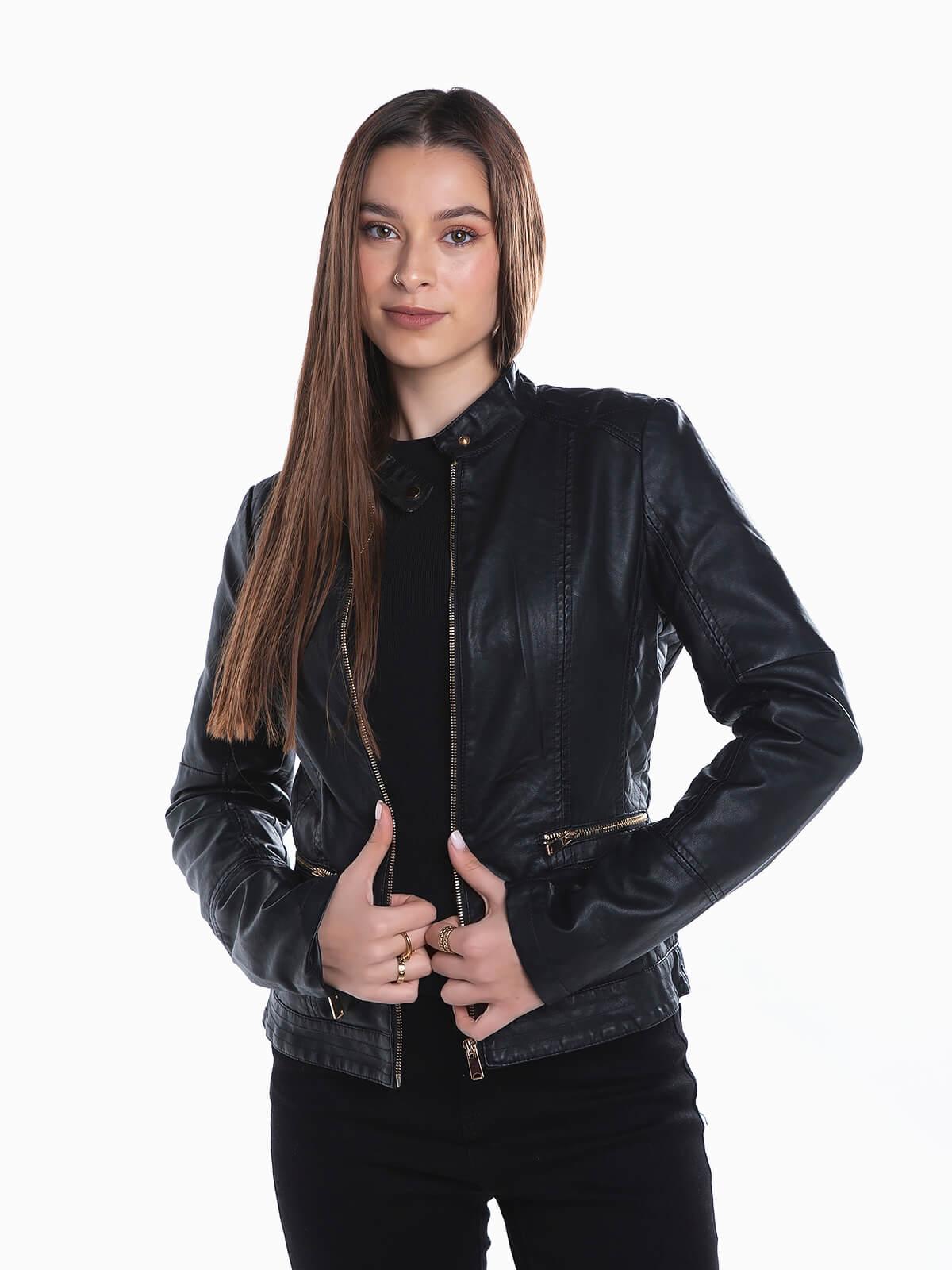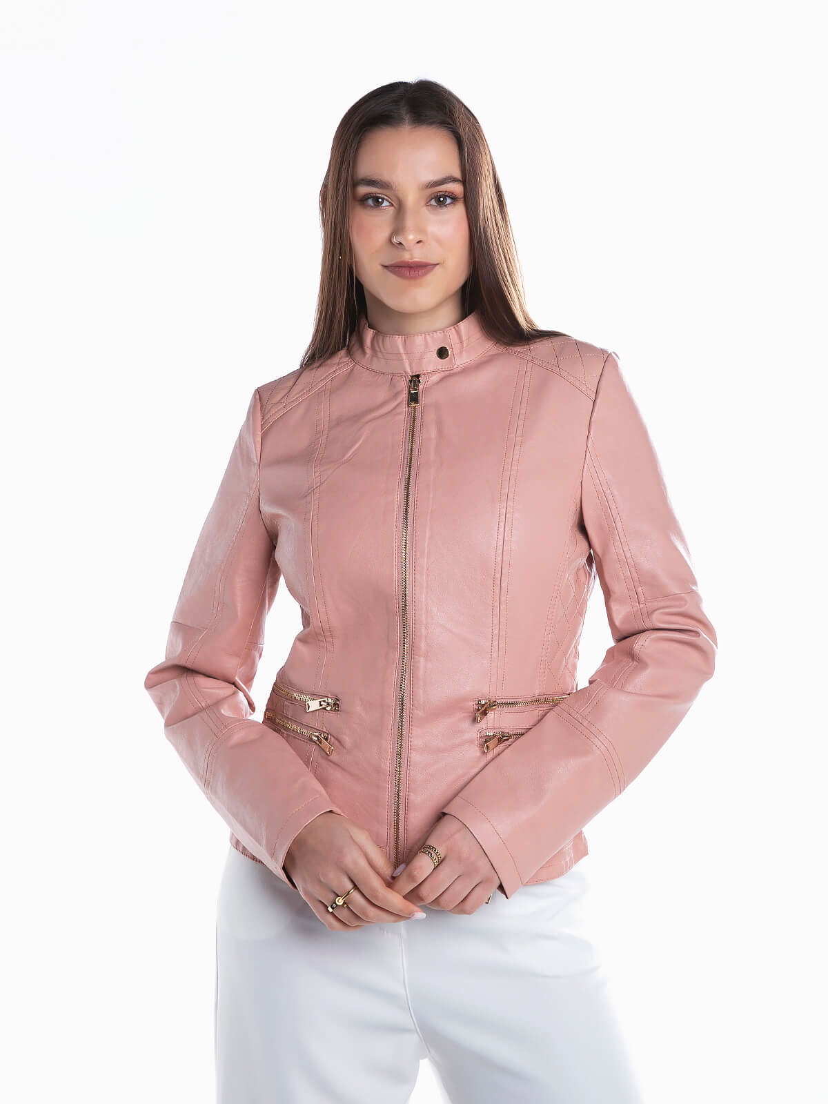 Blusão estilo motard justo para senhora. Blusão forrado com gola de padre e botão de pressão. Forrado. Manga comprida. 2 bolsos. Fechos decorativos. Aperto frontal de fecho zíper.