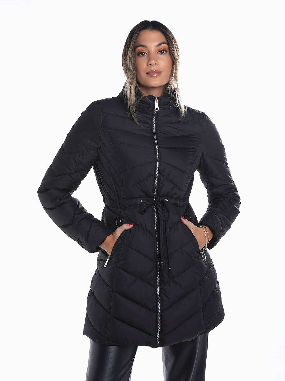 Blusão preto acolchoado impermeável com capuz e gola em pelo removíveis. Blusão comprido cintado com cordão para ajustar. Manga comprida e 2 bolsos. Aperto frontal fecho zíper.