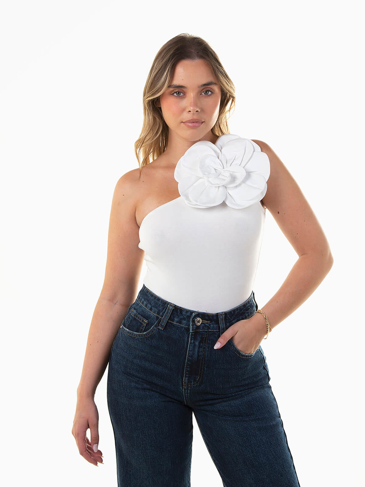 Body branco com corte assimétrico e flor 3D aplicada no ombro. Perfeito para dar destaque ao look sem precisar de muitos acessórios. Usa com calças de alfaiataria ou uma saia midi de cintura subida para um visual sofisticado, ou com ganga para contrastar o lado romântico com um toque mais casual.