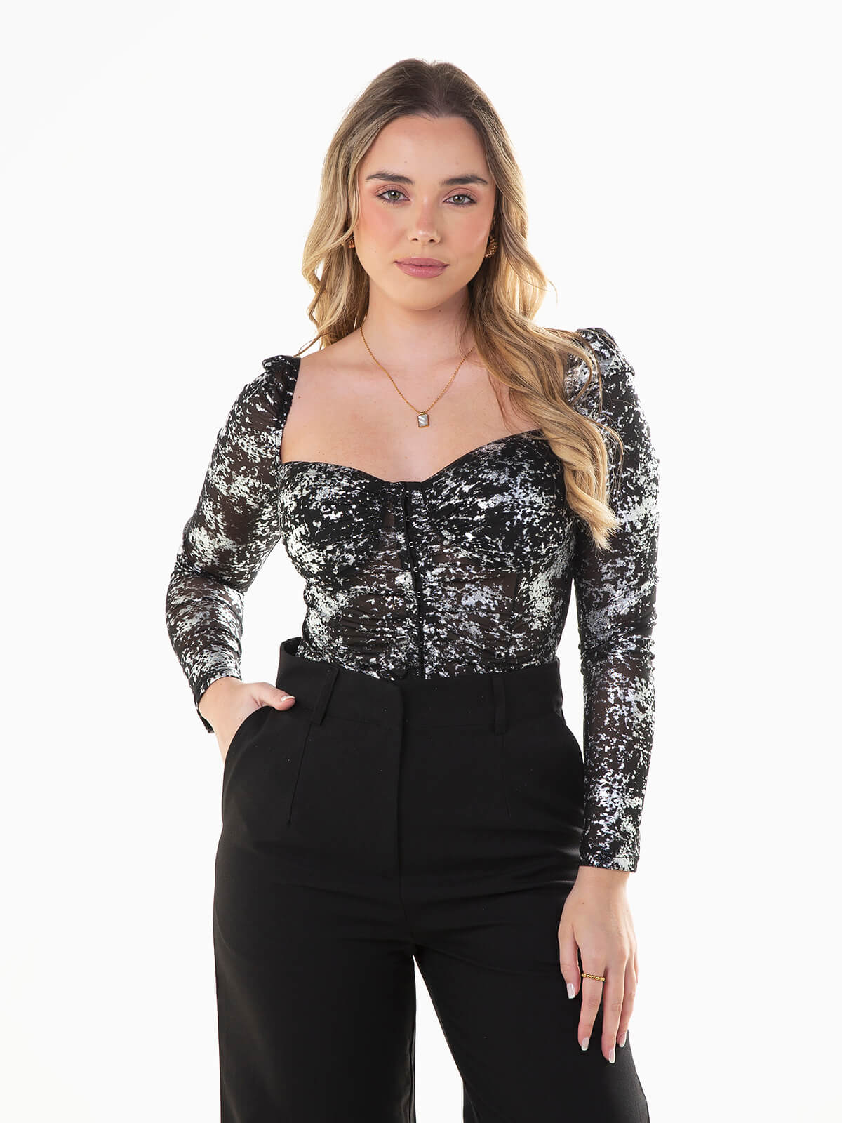 Body brilhante com efeito manchado para senhora. Body semitransparente de manga comprida com decote coração e peito almofadado. Aperto de colchetes.