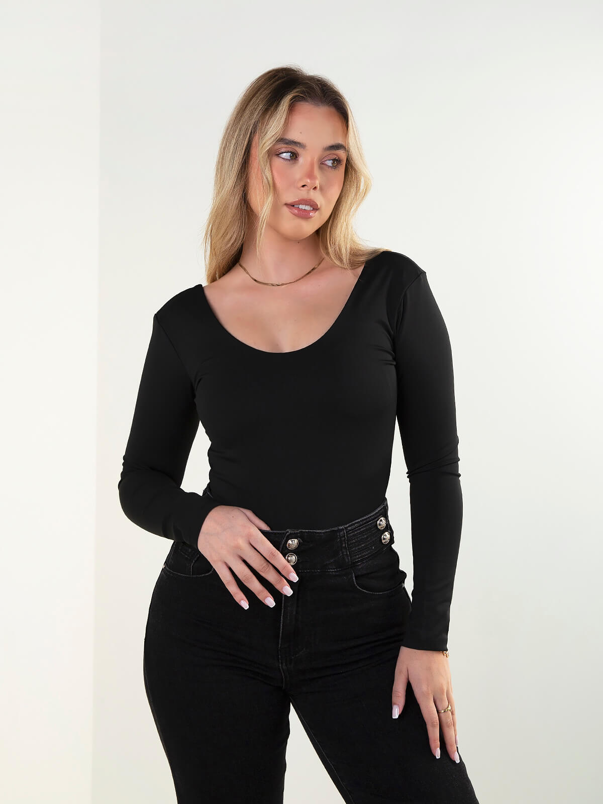 Body em tecido elástico com peito almofadado, decote redondo e manga comprida. Aperto inferior com molas para maior praticidade. Modelo com decote redondo, confortável e ajustado ao corpo.