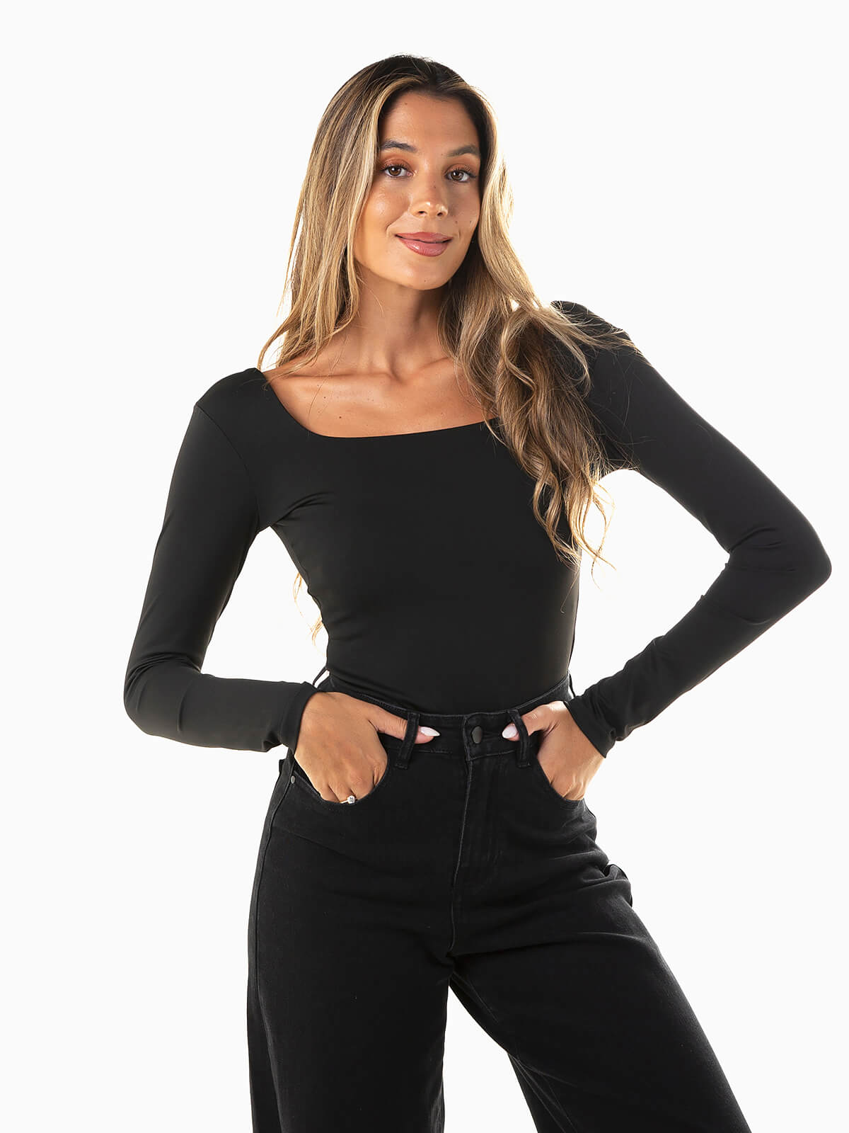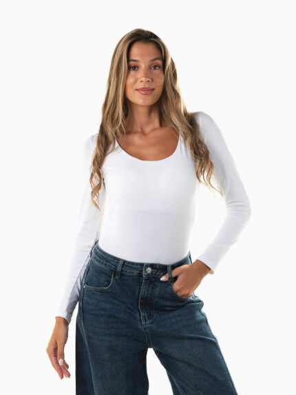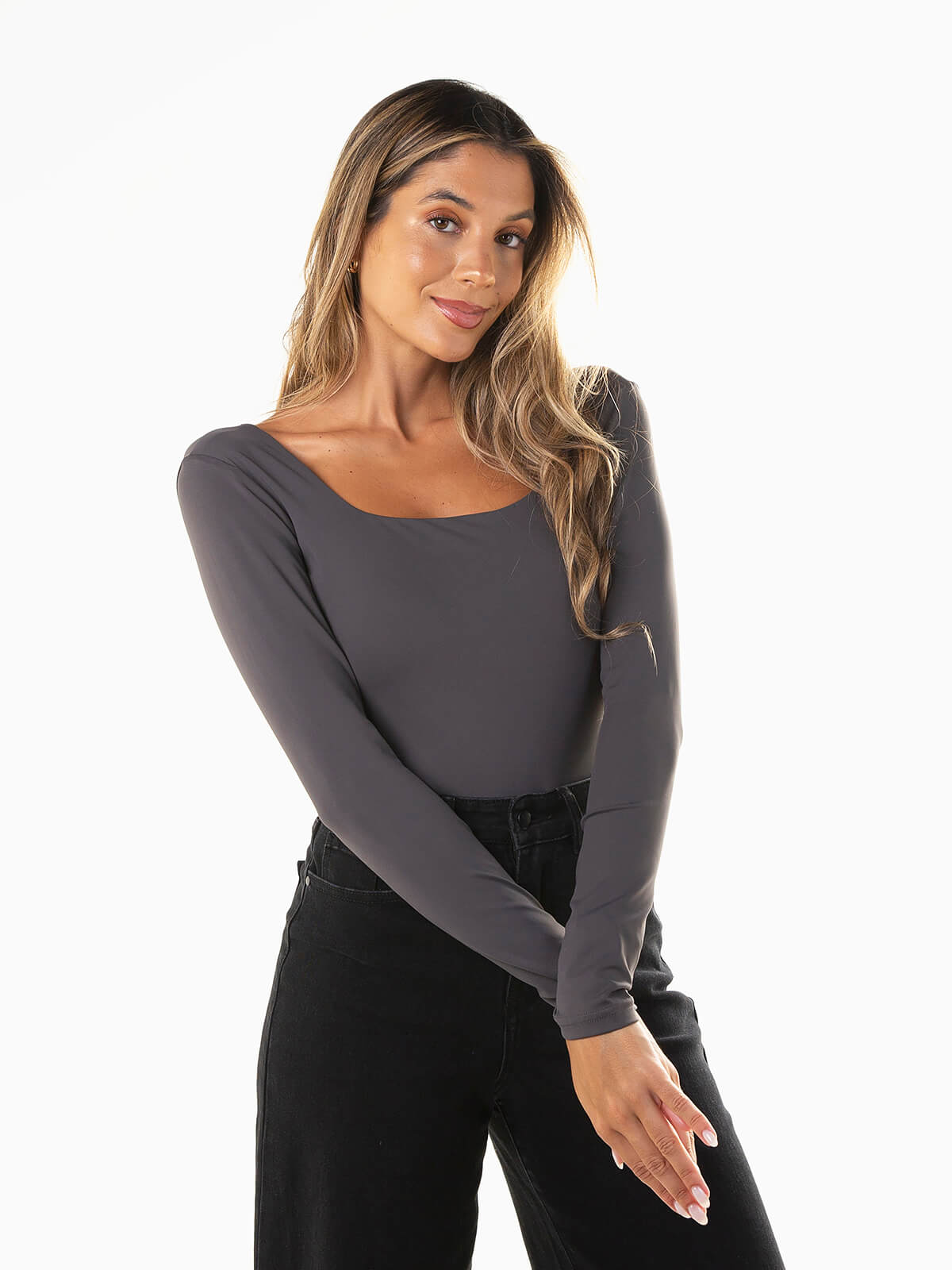Body elástico de manga comprida com decote quadrado à frente e atrás, que valoriza a silhueta e garante conforto. Ideal para looks modernos e versáteis, combinando facilmente com calças, saias ou calções para um outfit cheio de atitude.
