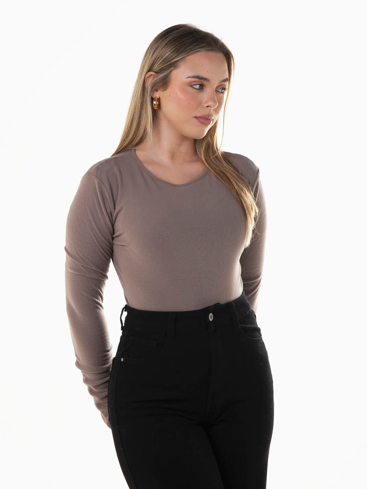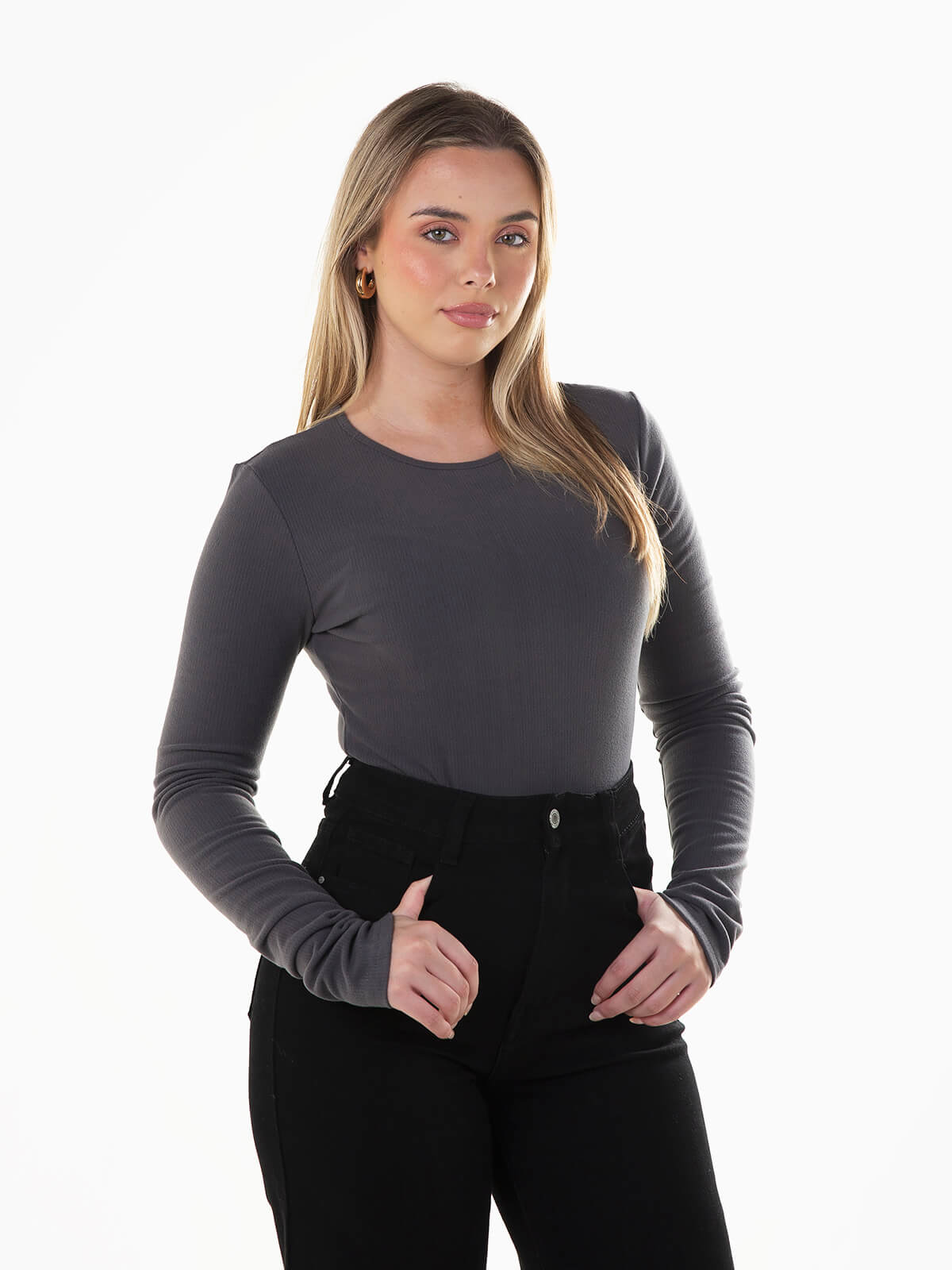 Body em malha canelada quente e confortável com decote redondo. Body elástico de manga comprida com aperto de botões de pressão.