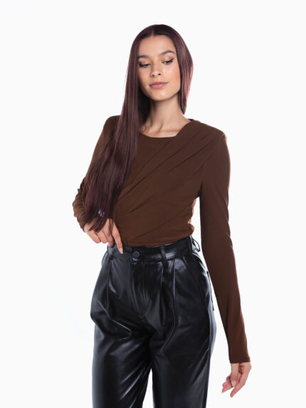 Body de manga comprida com decote em V profundo e pormenor efeito nó. Body elástico liso. Aperto de botões de pressão.