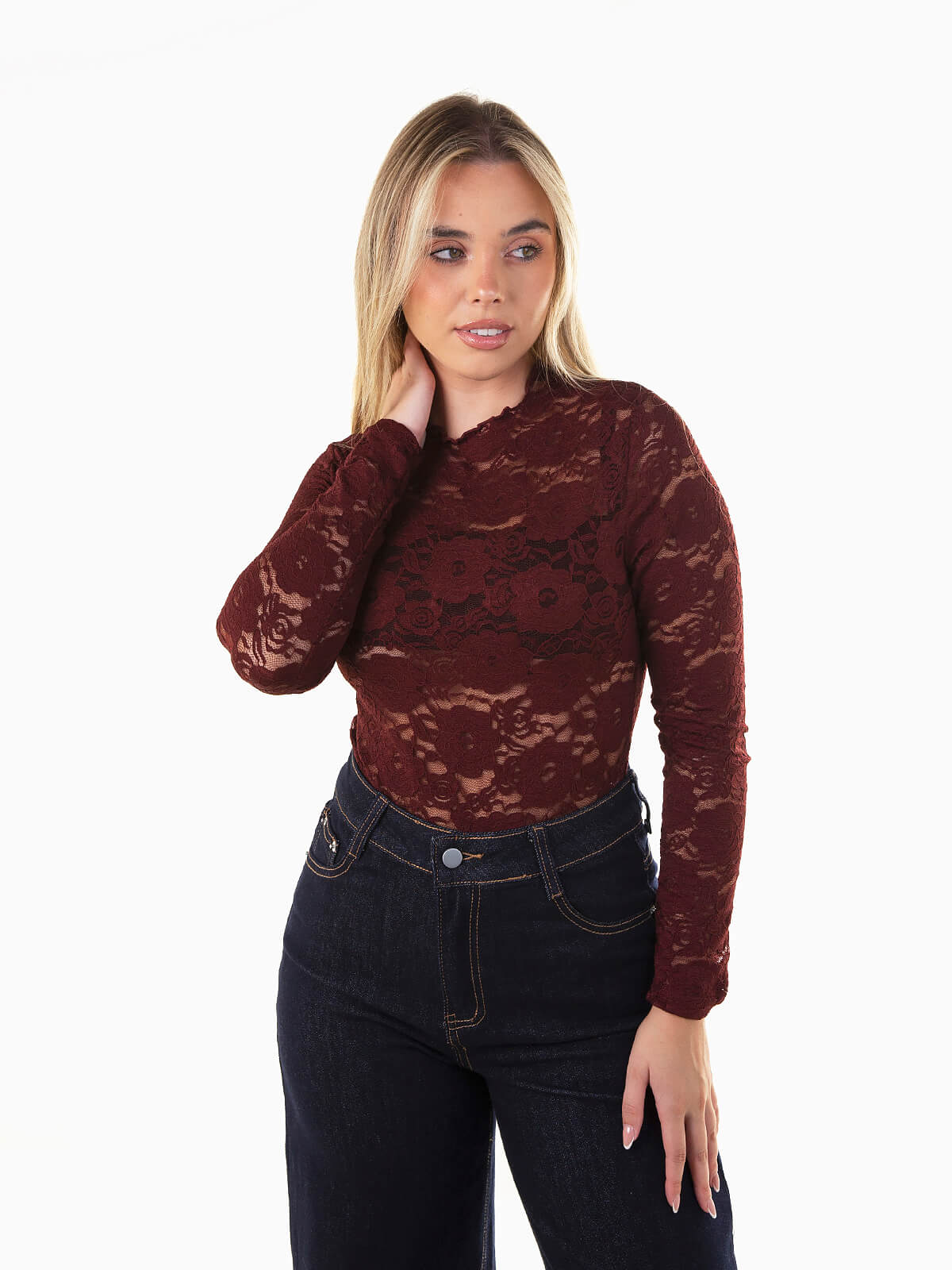 Body de manga comprida em renda com gola ligeiramente subida e acabamento rolling. Peça delicada e versátil, perfeita para coordenados elegantes ou looks modernos com camadas.