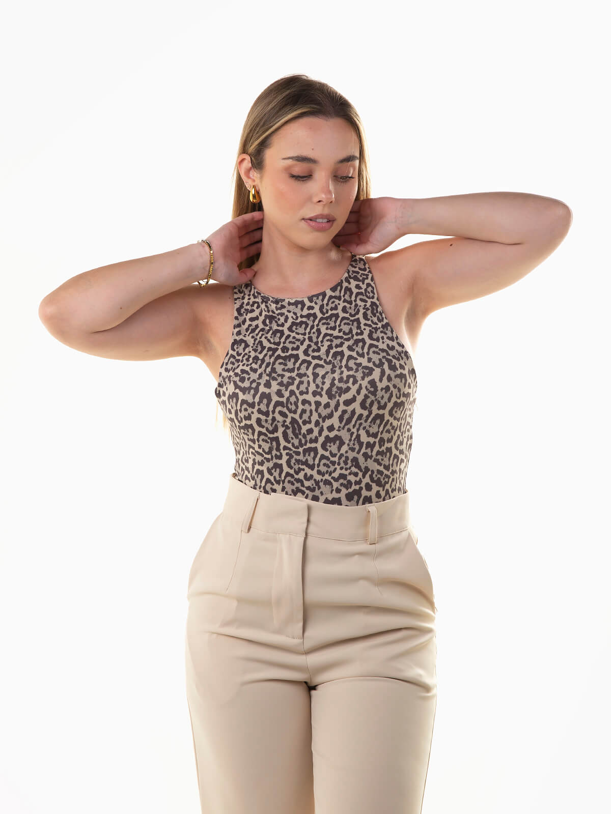 Body sem mangas com estampado leopardo para mulher. Body elástico com decote halter e aperto de botões pressão.