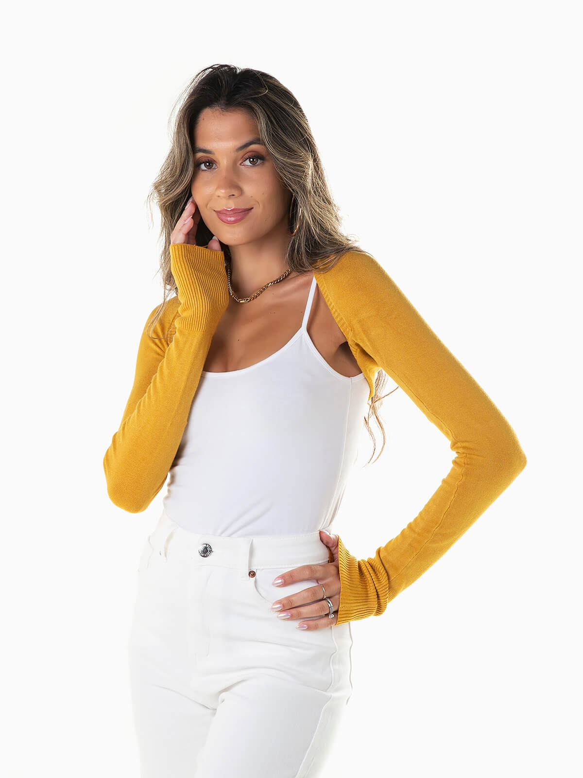 Bolero curto com acabamentos canelados no punho. Casaco cropped em malha macia com mistura de viscose e orla canelada a contornar as extremidades.
