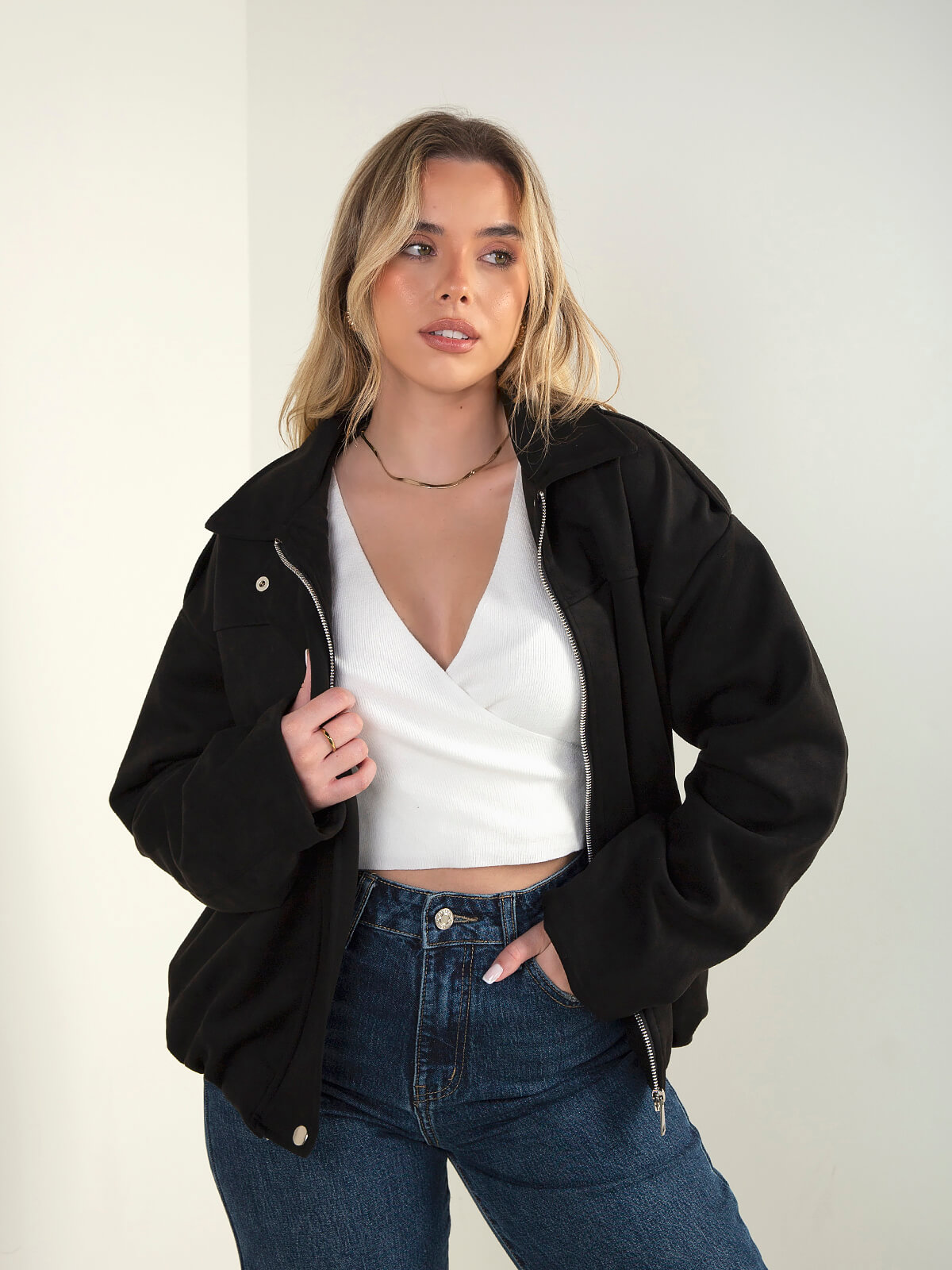 Bomber de mulher em efeito camurça, com interior forrado e dois bolsos. Um casaco leve e versátil, perfeito para looks casuais e streetwear. Combina com jeans de cintura alta e top básico para um look urbano fácil e moderno.