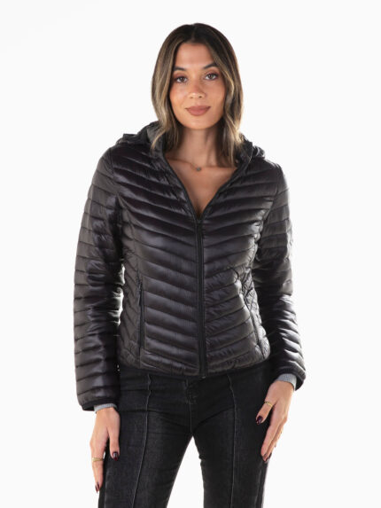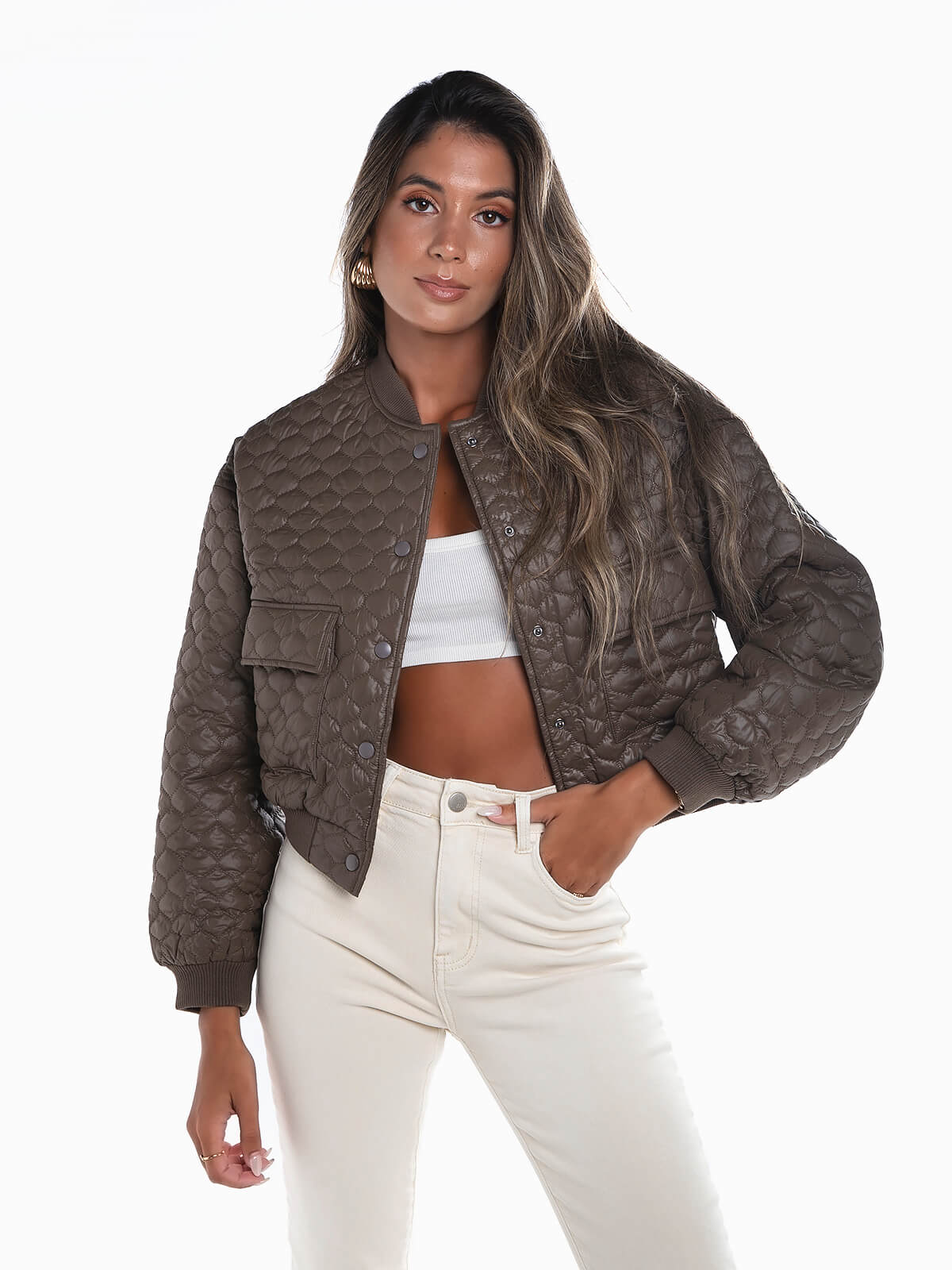 Bomber corte oversize com acolchoado leve e impermeável. Blusão manga comprida com acabamentos canelados no mesmo tom. 2 bolsos. Aperto frontal botões de pressão.