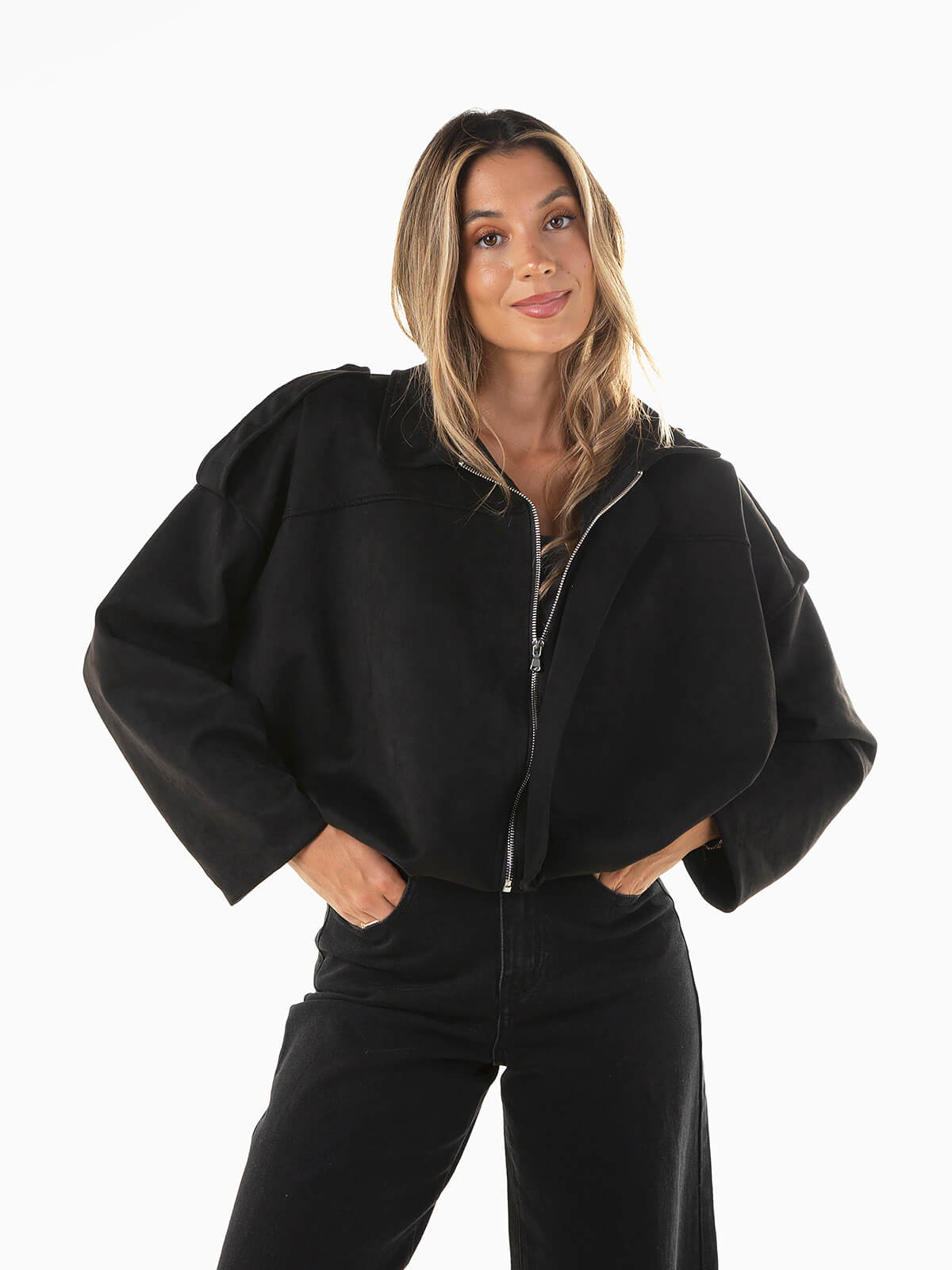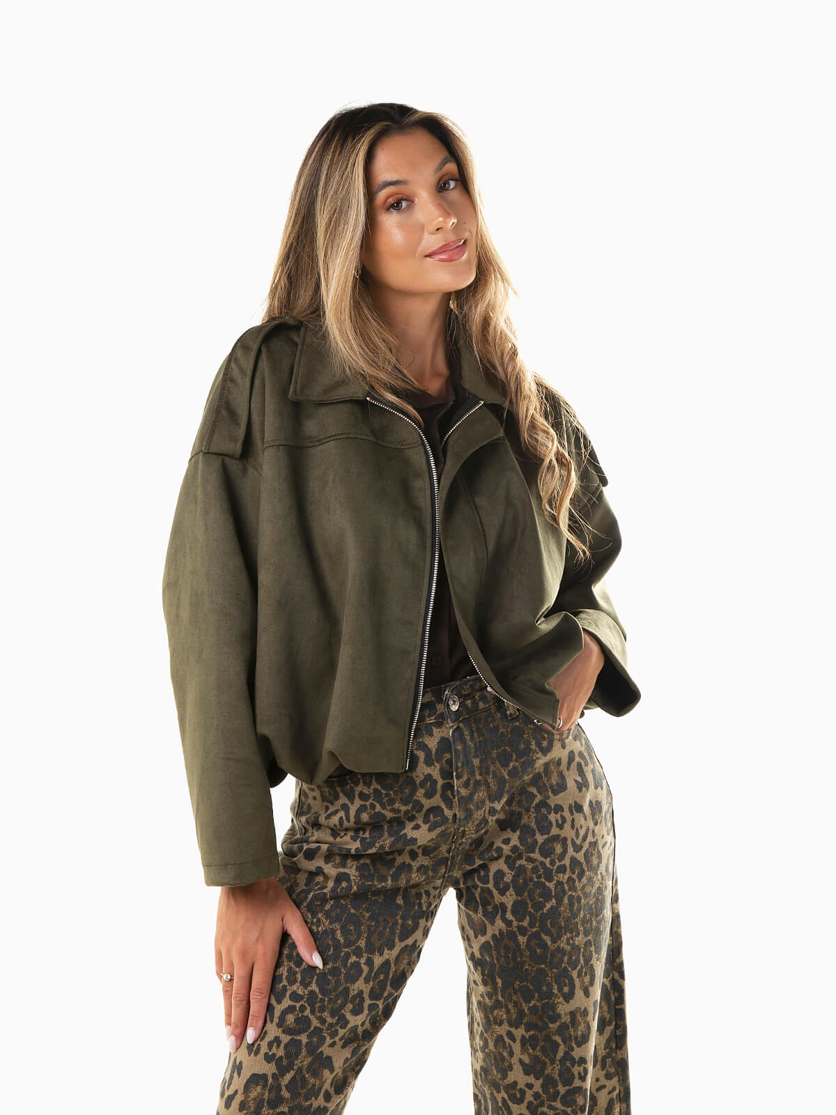 O bomber em efeito camurça é uma das apostas da estação. Com corte descontraído, gola clássica e fecho éclair frontal, combina conforto e estilo. A base e os punhos elásticos dão-lhe um toque moderno e prático, tornando-o a escolha ideal para looks casuais cheios de atitude. Uma peça tendência que se integra facilmente em qualquer guarda-roupa de moda acessível.