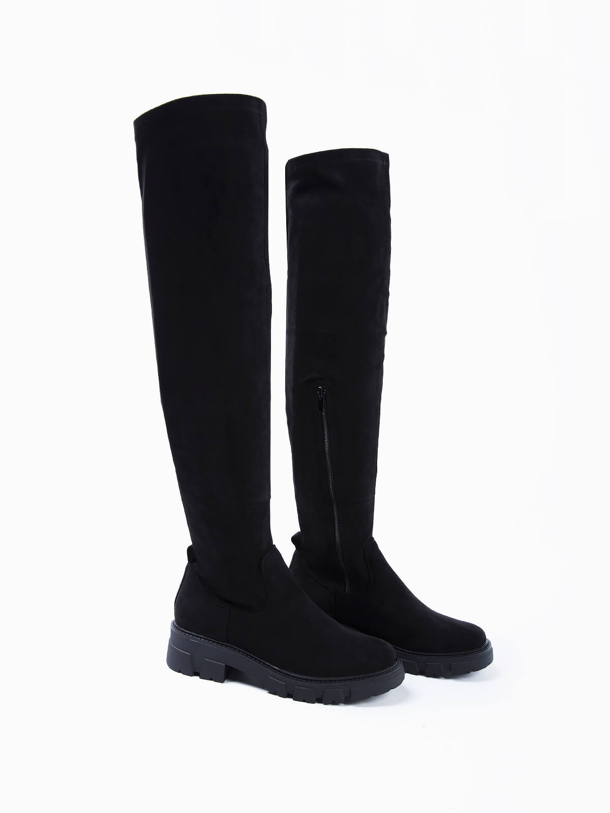 Botas de cano alto em camurça cor preta. Aperto de fecho de correr de lado. Sola grossa de borracha. Pormenor de puxador atrás. Altura do tacão: 4,5 cm.