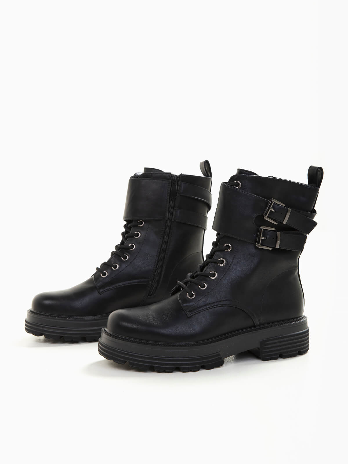 Botas pretas estilo militar com efeito pele e dupla fivela. Sola chunky. Aperto de cordões e fecho zíper na lateral. Altura da sola: 4 cm