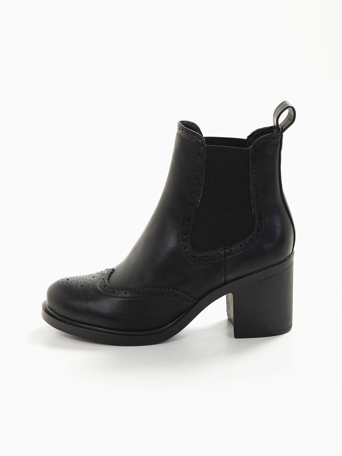 Botins estilo chelsea pretos com pormenor de pespontos à frente. Botas com biqueira redonda e elástico nas laterais.