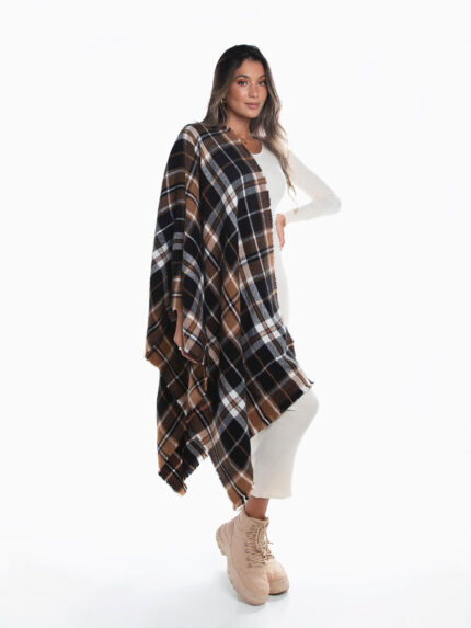 Cachecol comprido com estampado de xadrez para senhora. Pormenores lisos. Acabamentos desfiados.