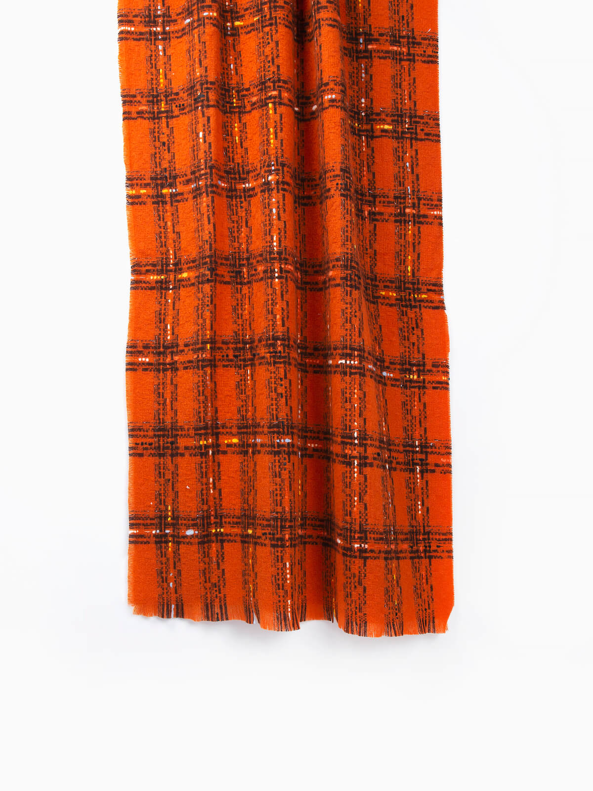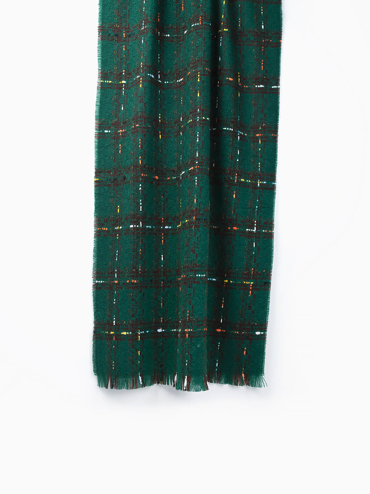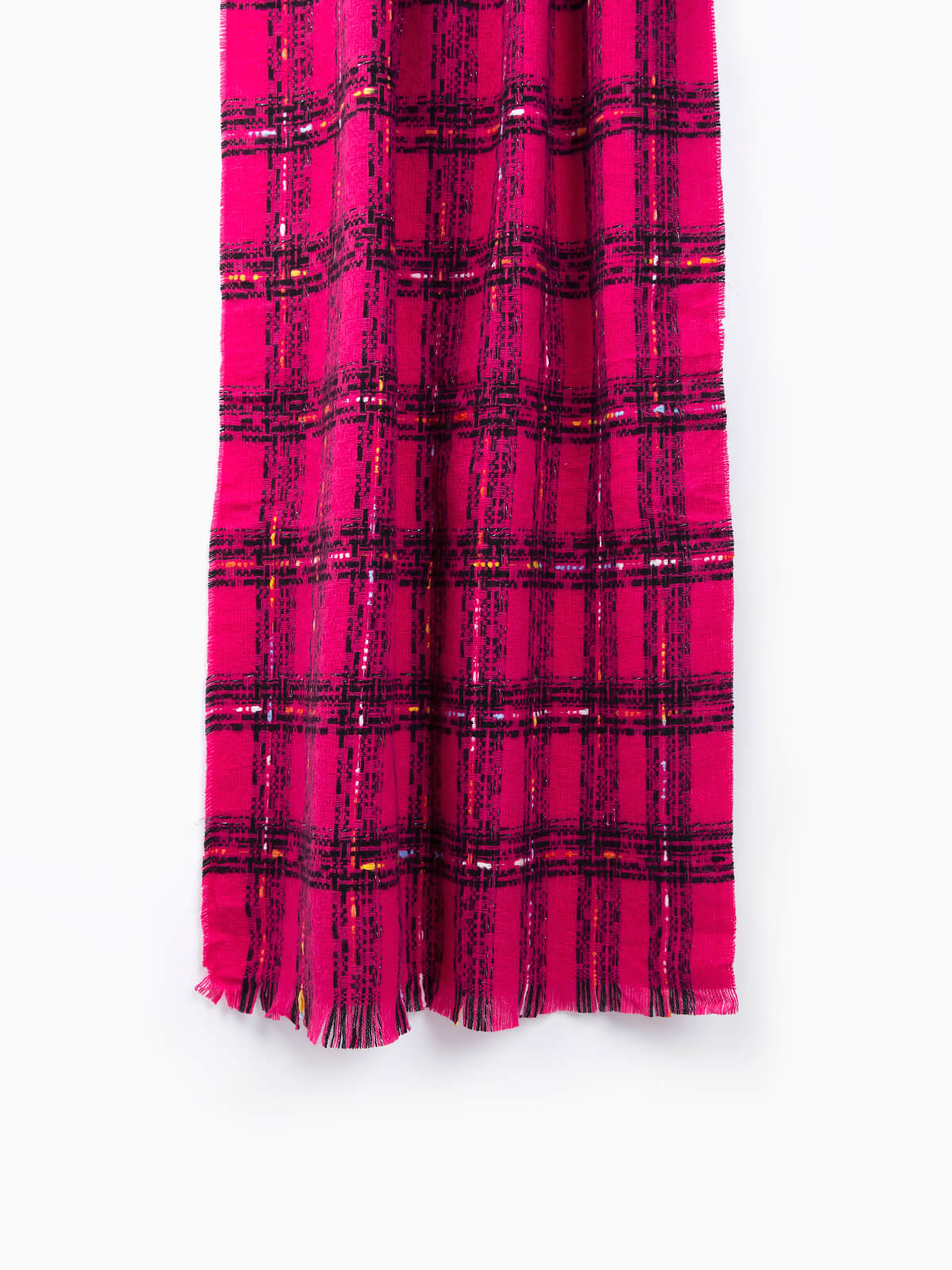 Cachecol comprido em xadrez com linhas coloridas para senhora. Cachecol com acabamentos desfiados.