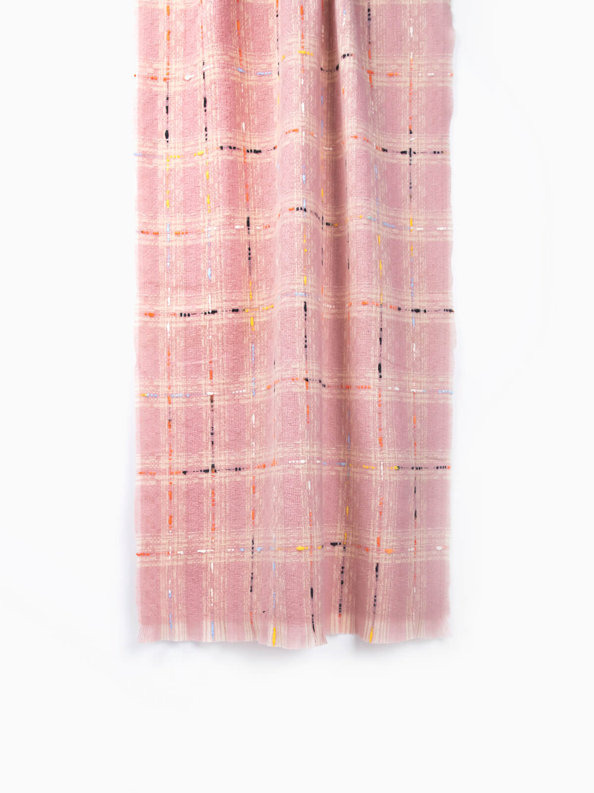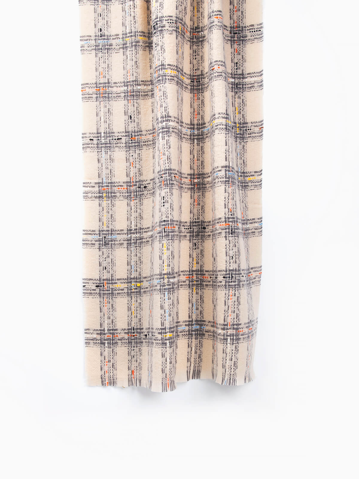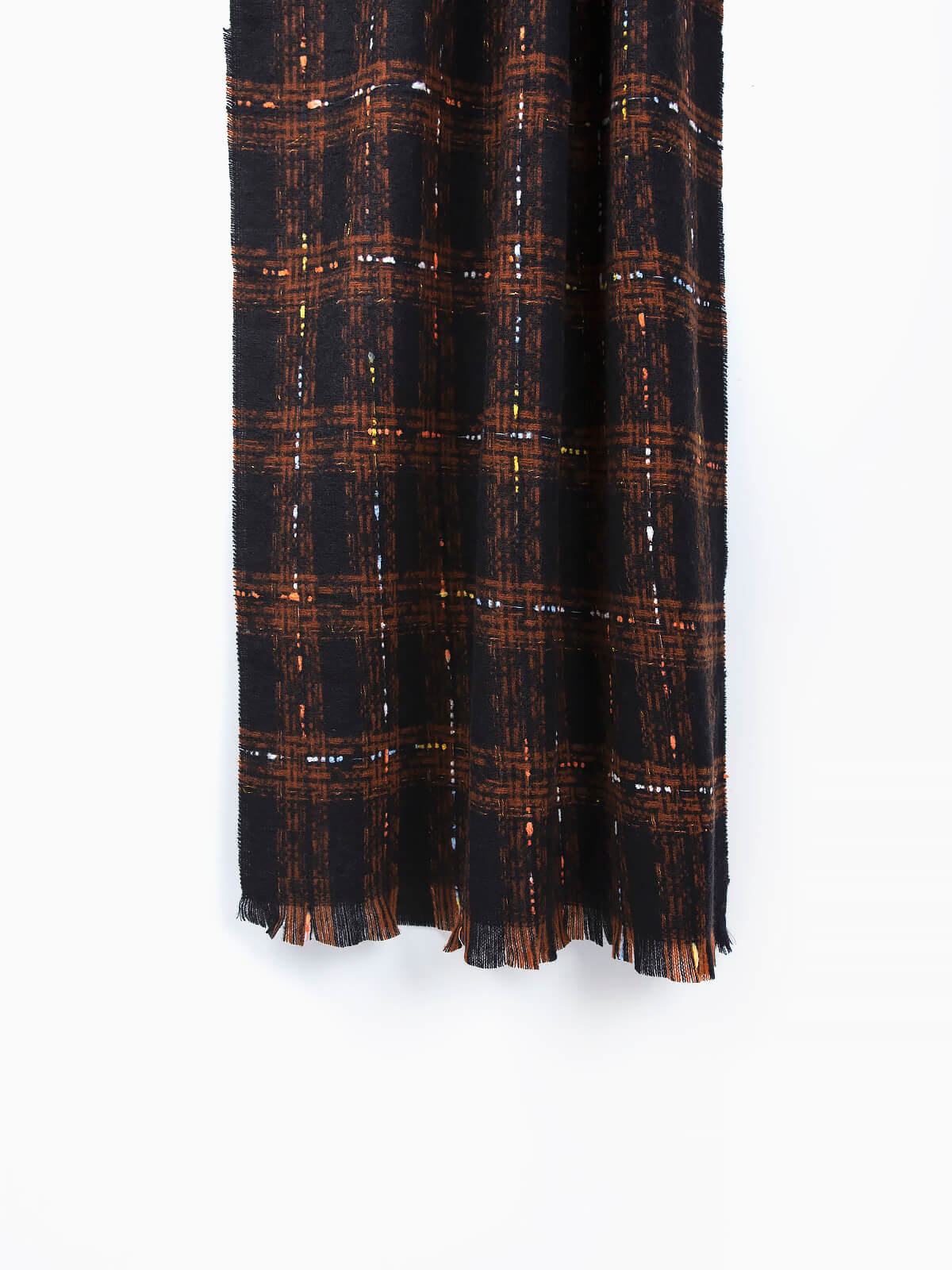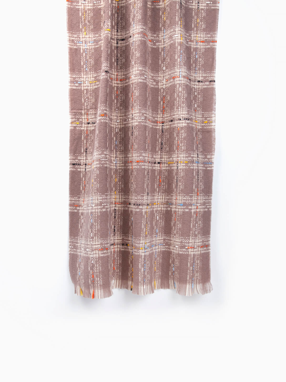 Cachecol comprido em xadrez com linhas coloridas para senhora. Cachecol com acabamentos desfiados.