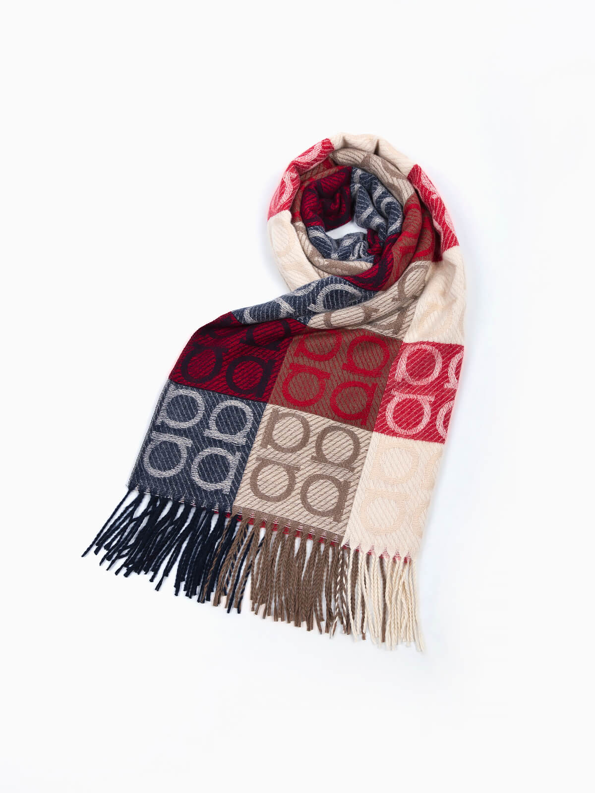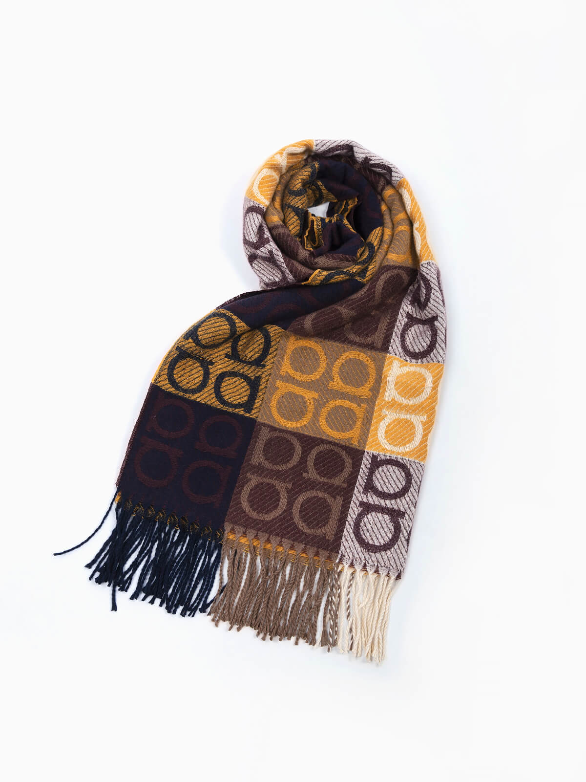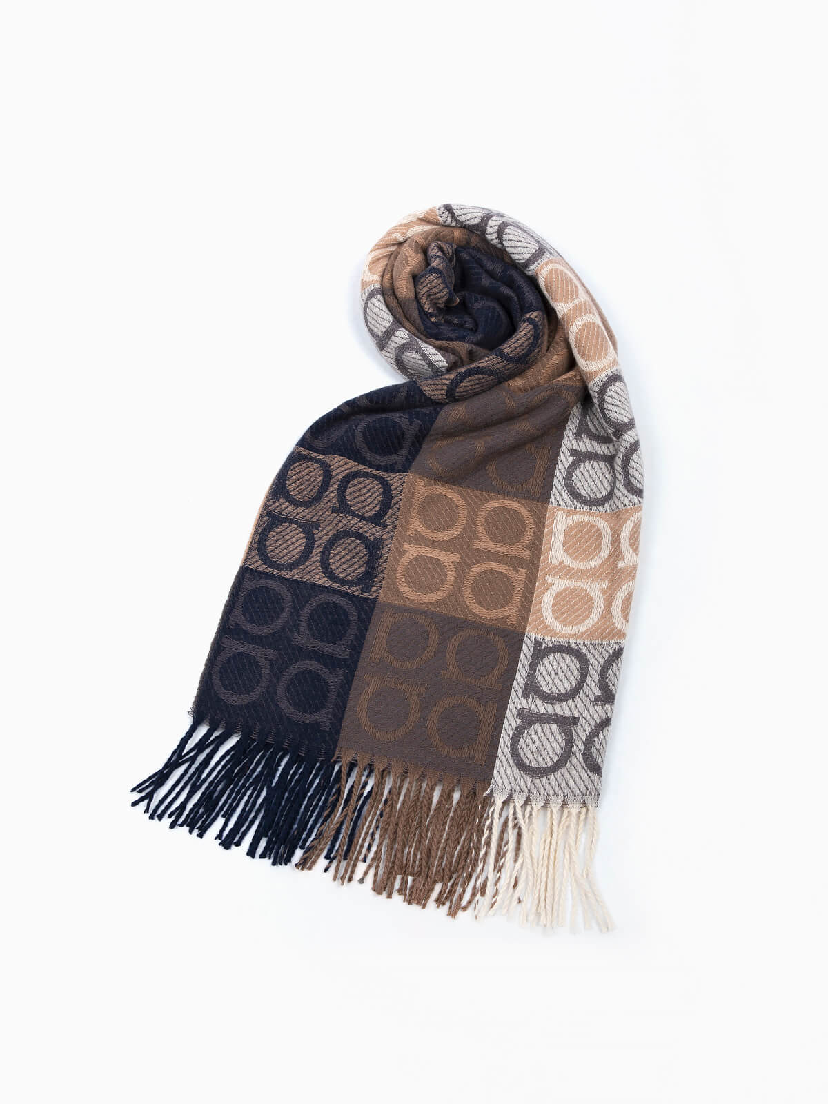 Cachecol estampado geométrico colorido com franjas nas extremidades. Cachecol largo.