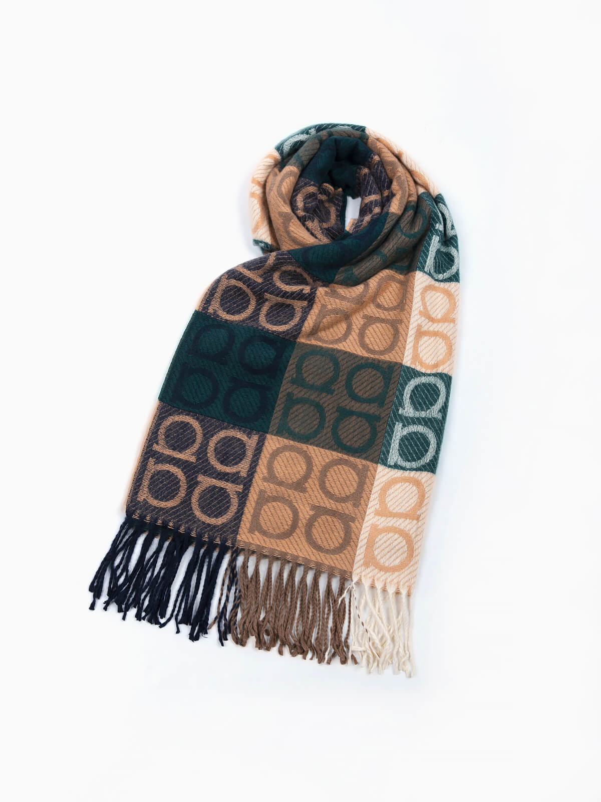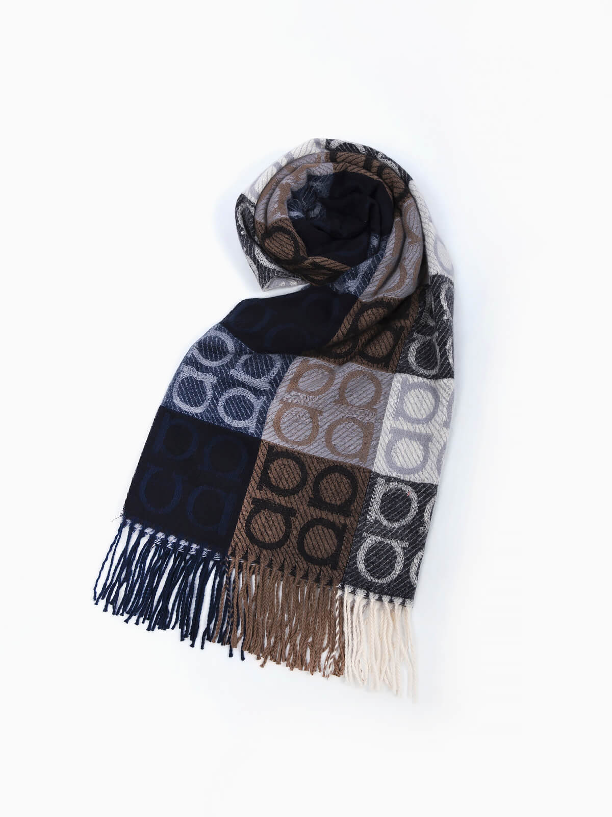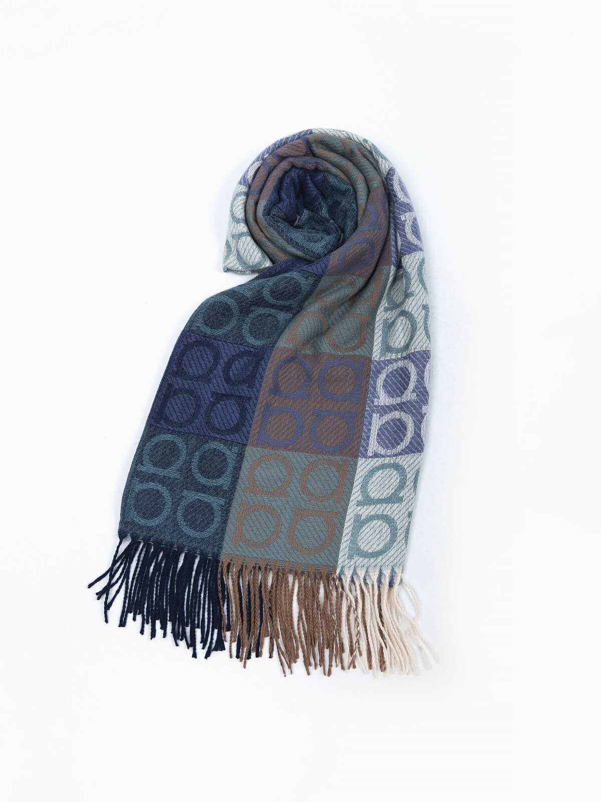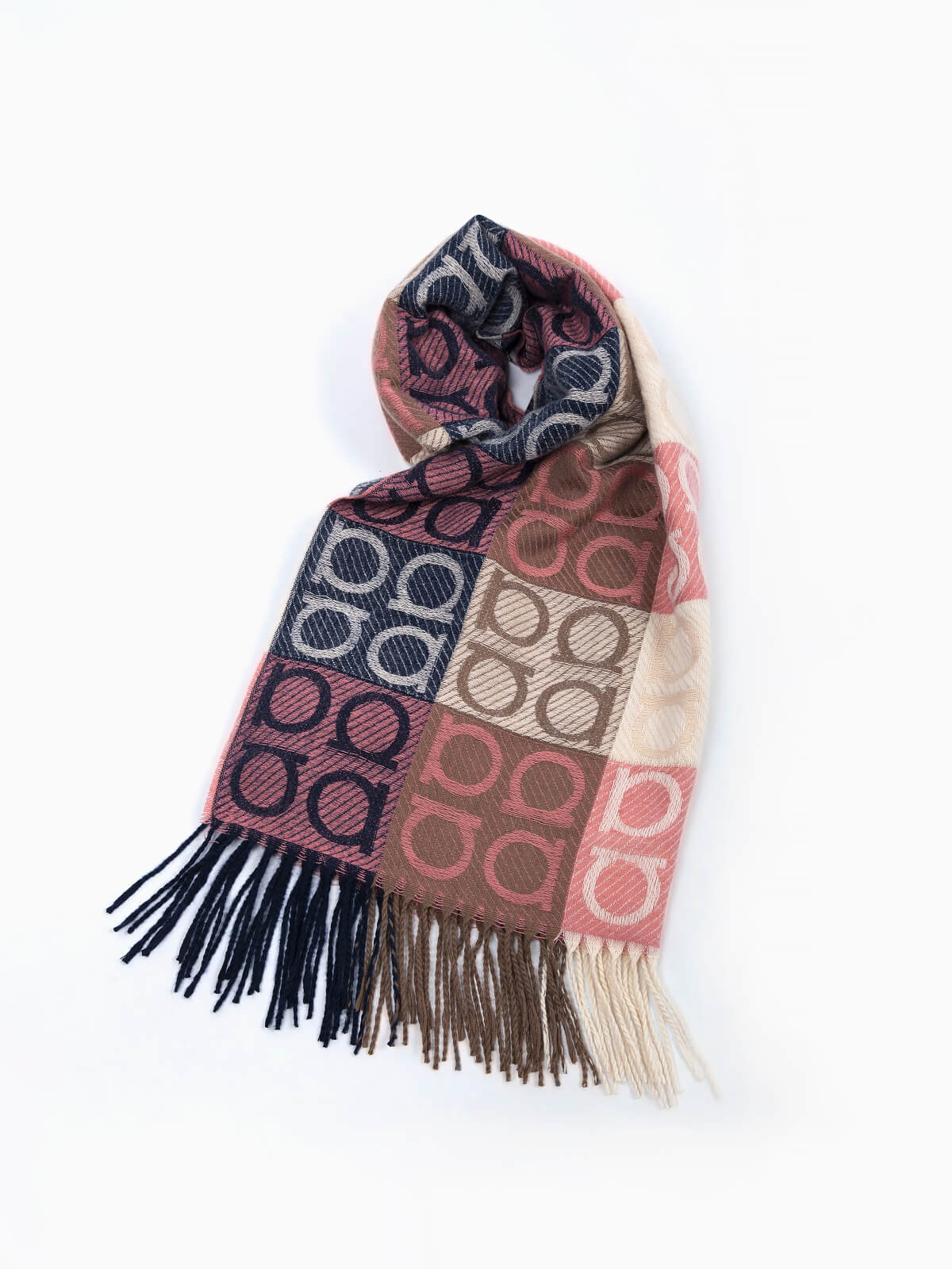 Cachecol estampado geométrico colorido com franjas nas extremidades. Cachecol largo.