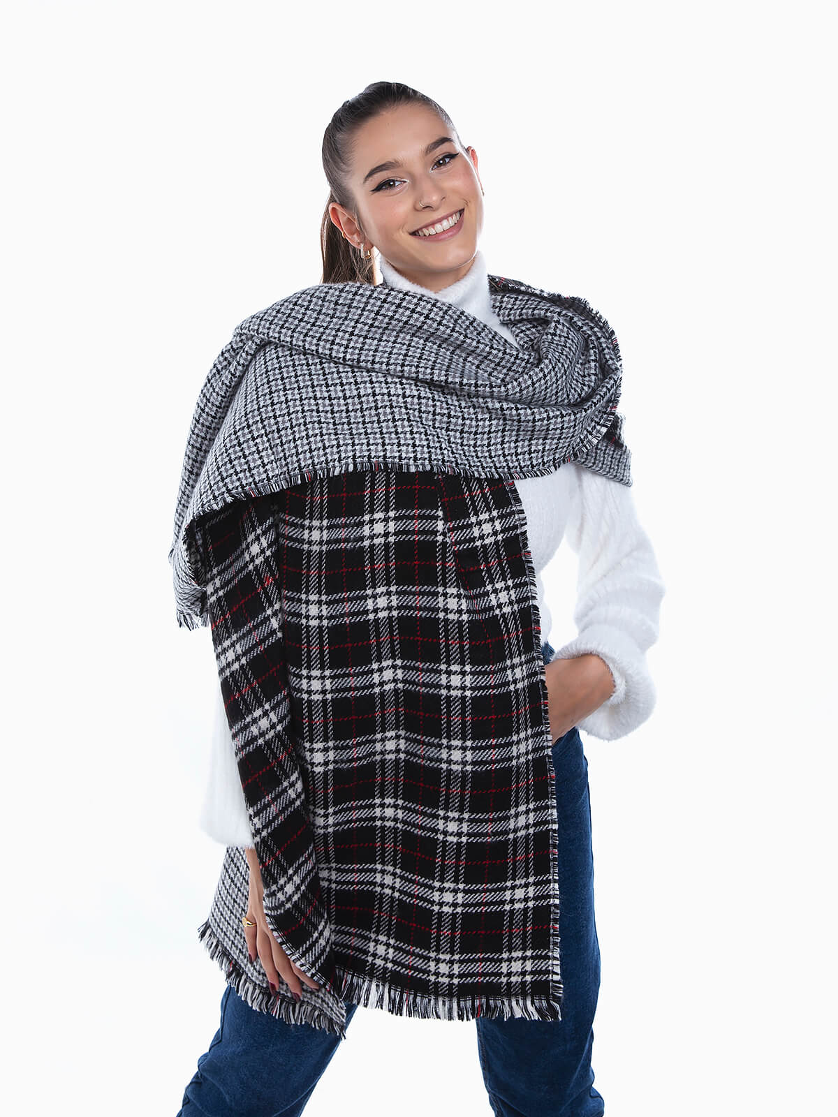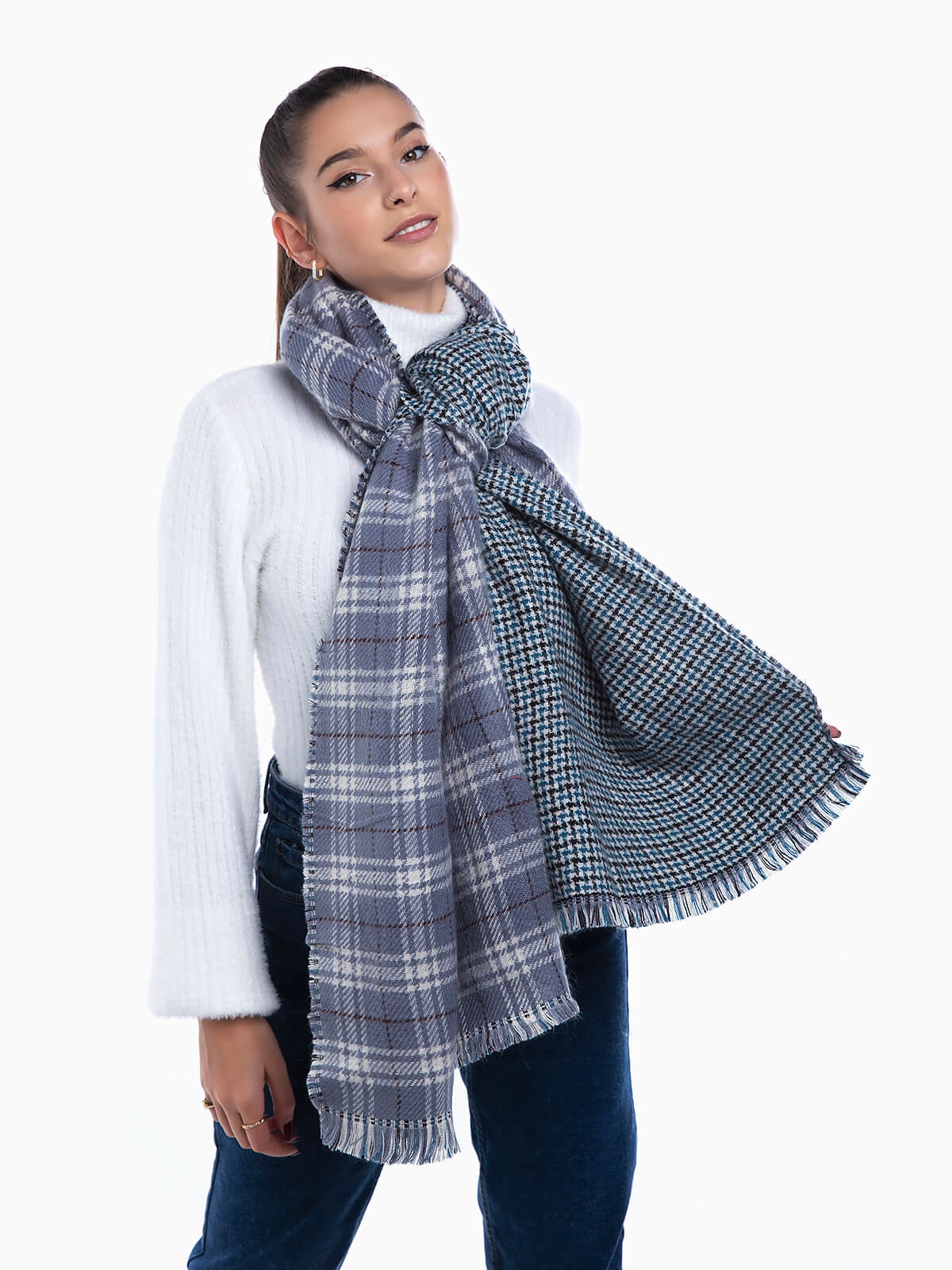 Cachecol em malha com estampado xadrez para senhora. Cachecol largo com franjas.