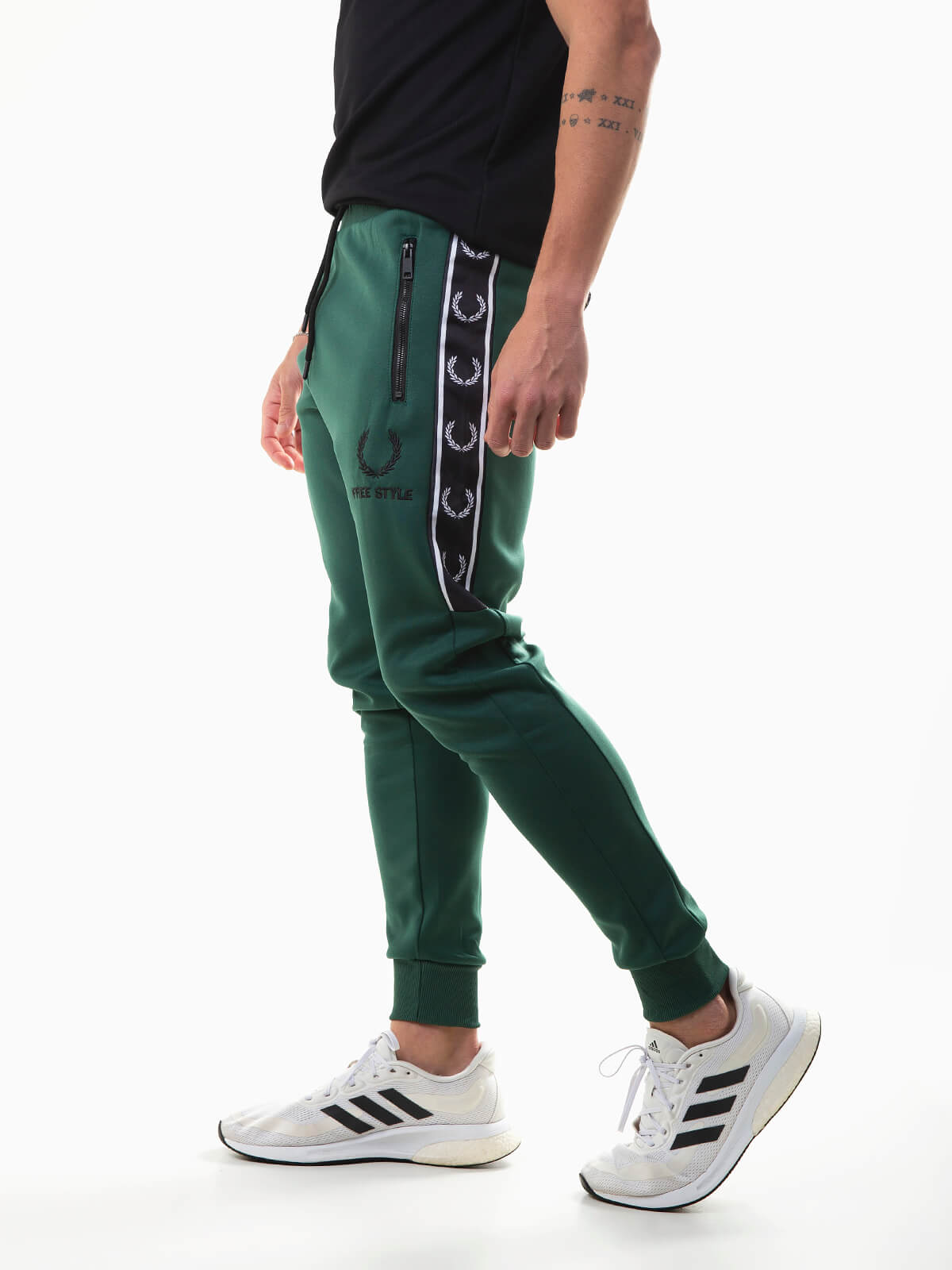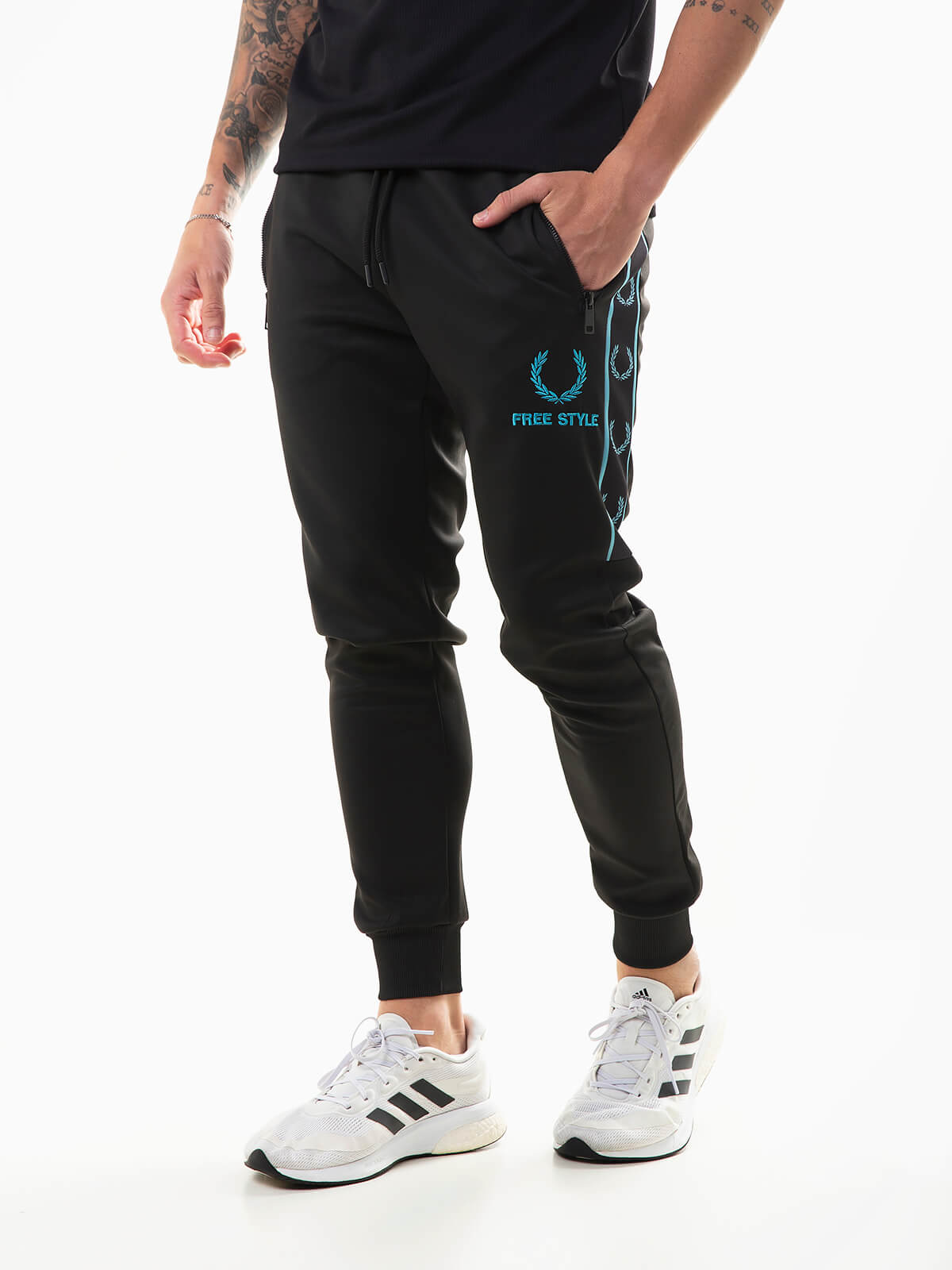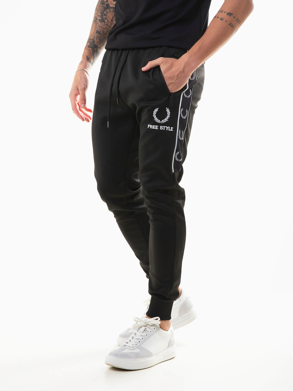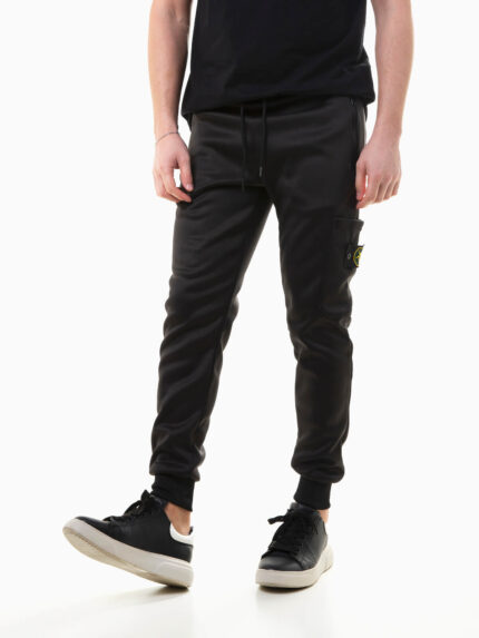 Calças desportivas em acetato para maior leveza e conforto. Calças fato treino com punhos elásticos e cordão na cintura para ajustar. Bandas laterais em contraste. 2 bolsos.