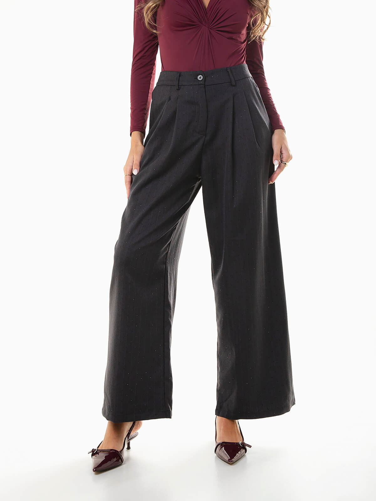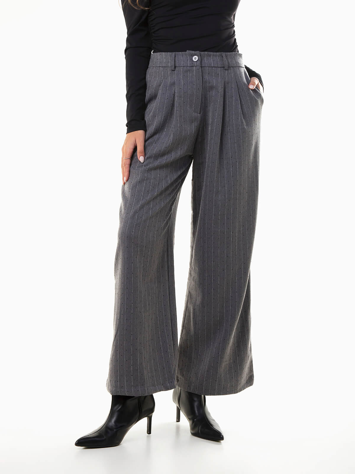 Calças femininas de alfaiataria com padrão riscas diplomáticas e aplicação de strass ao longo da peça. De cintura alta e cós elástico atrás para maior conforto, apresentam pregas frontais e fecho-éclair com botão. Uma escolha sofisticada e moderna que combina elegância com um toque de brilho — ideal para usar com o blazer a condizer.