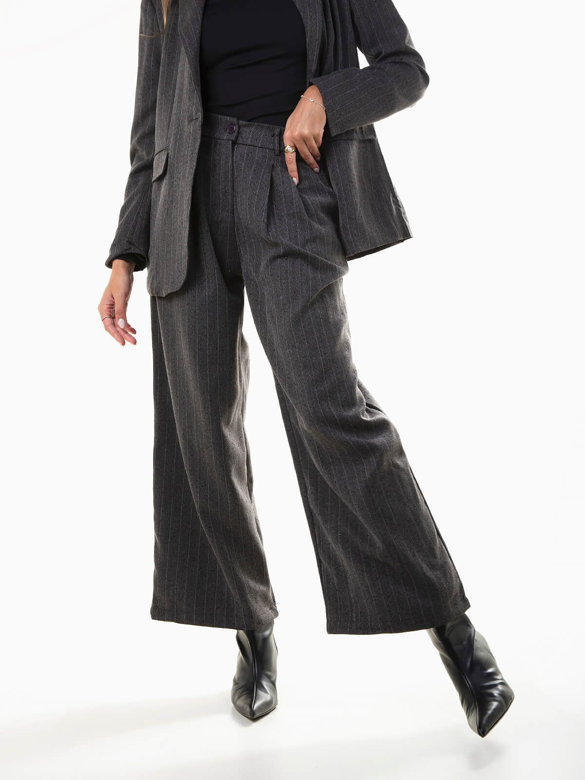 Início Mulher Calças Calças alfaiataria com riscas e strass