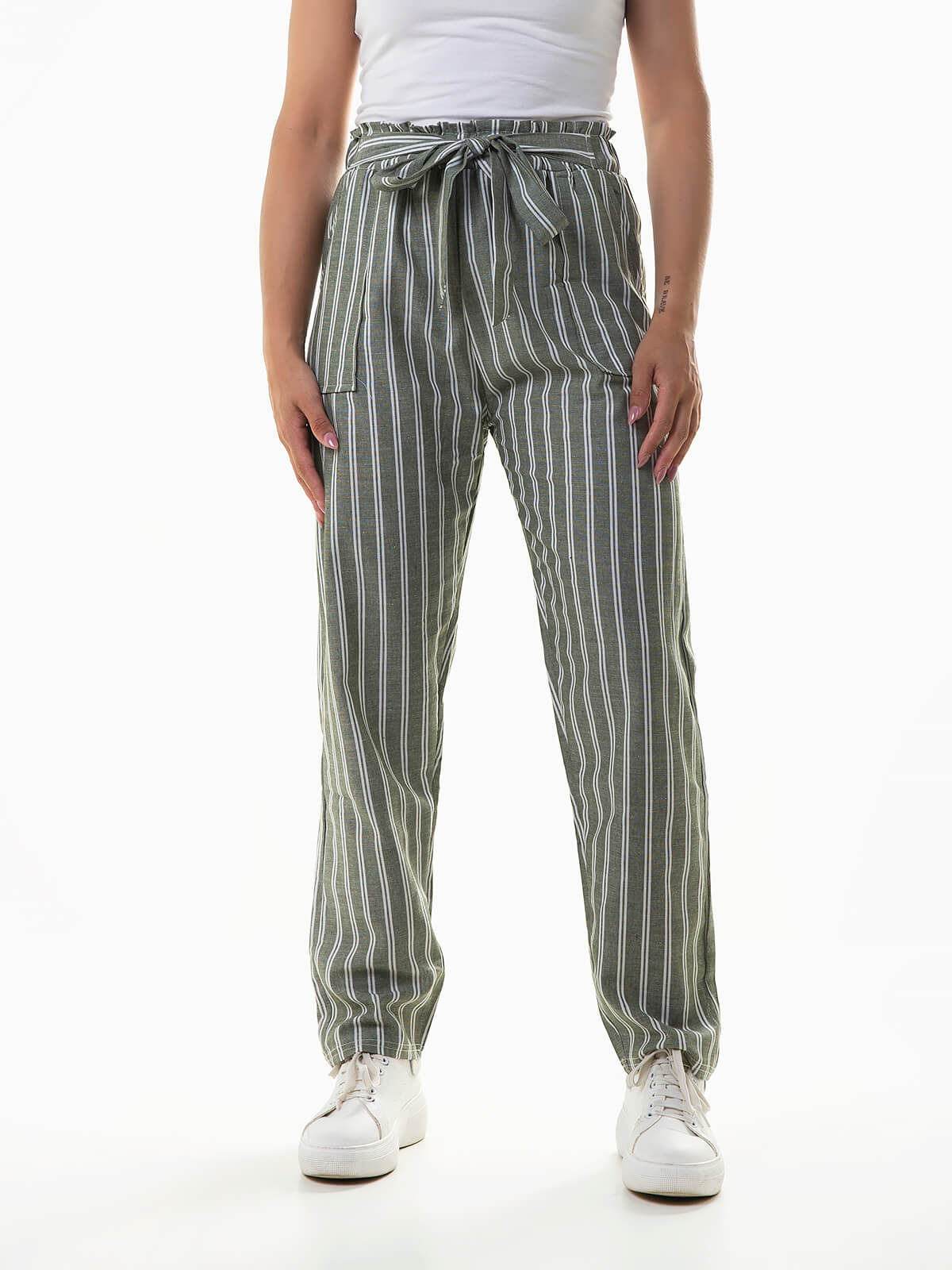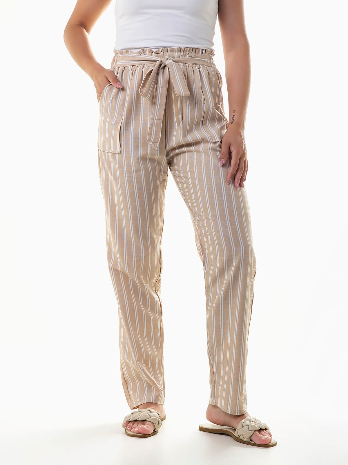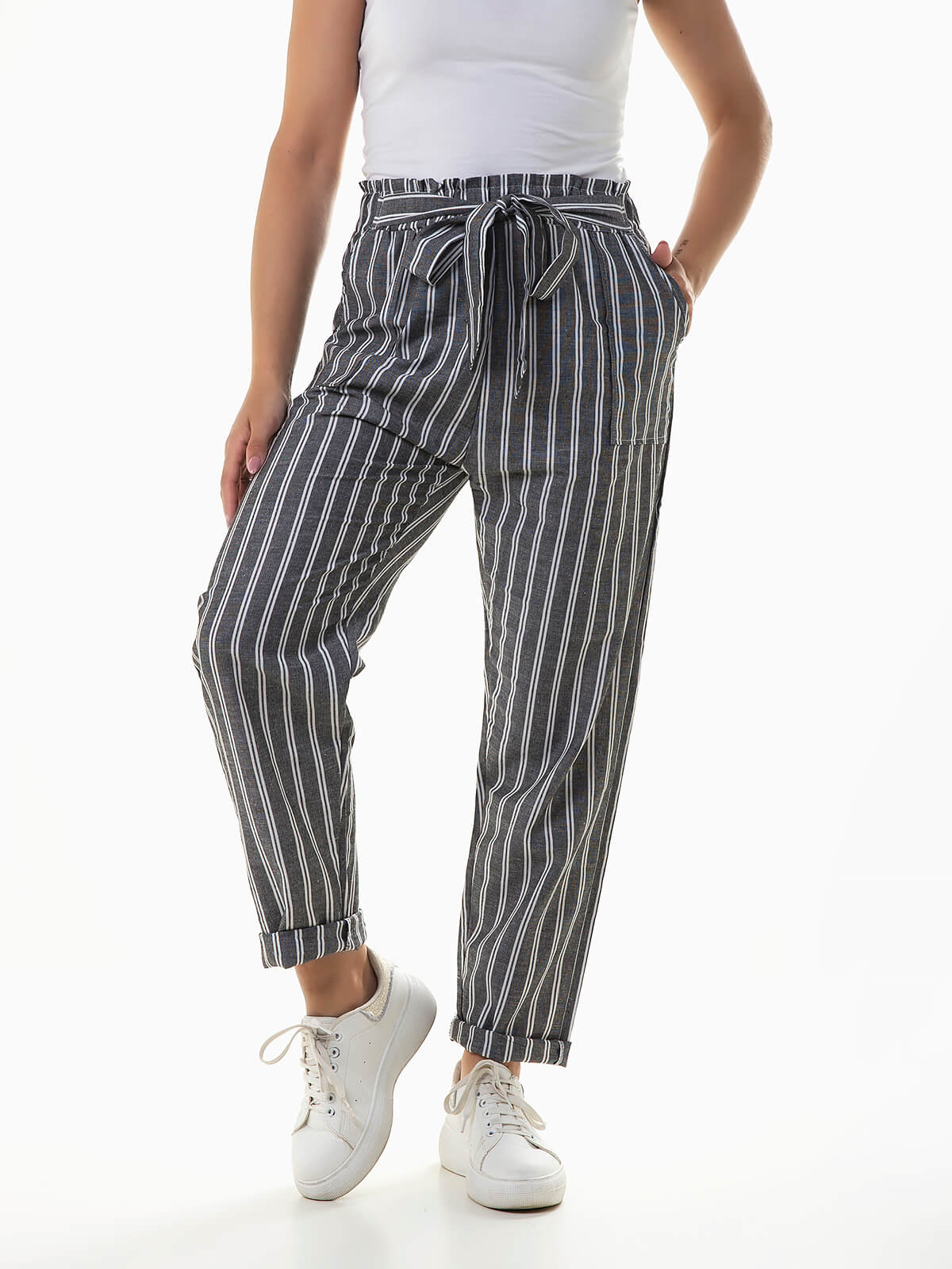 Calças às riscas confecionadas em tecido viscose com aparência linho. Calças de cintura paperbag com tecido para laço. 2 bolsos.