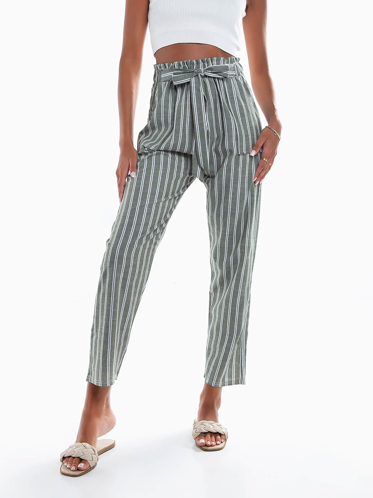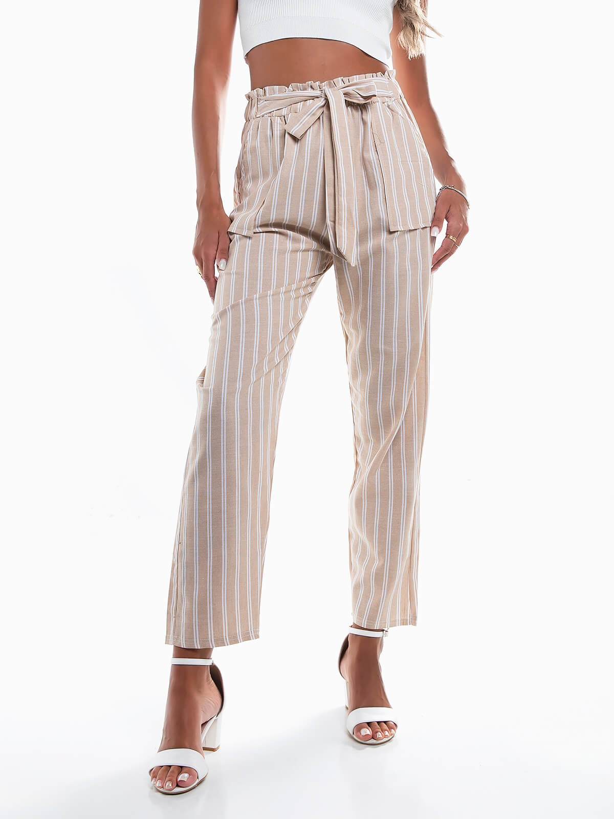 Calças às riscas com cintura alta paperbag elástica. Calças com tecido para laço e 2 bolsos.