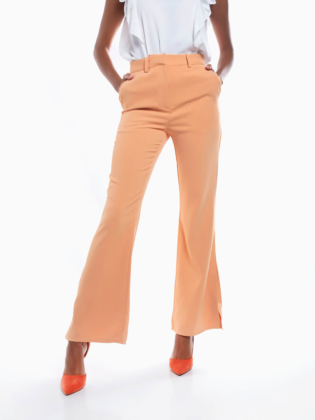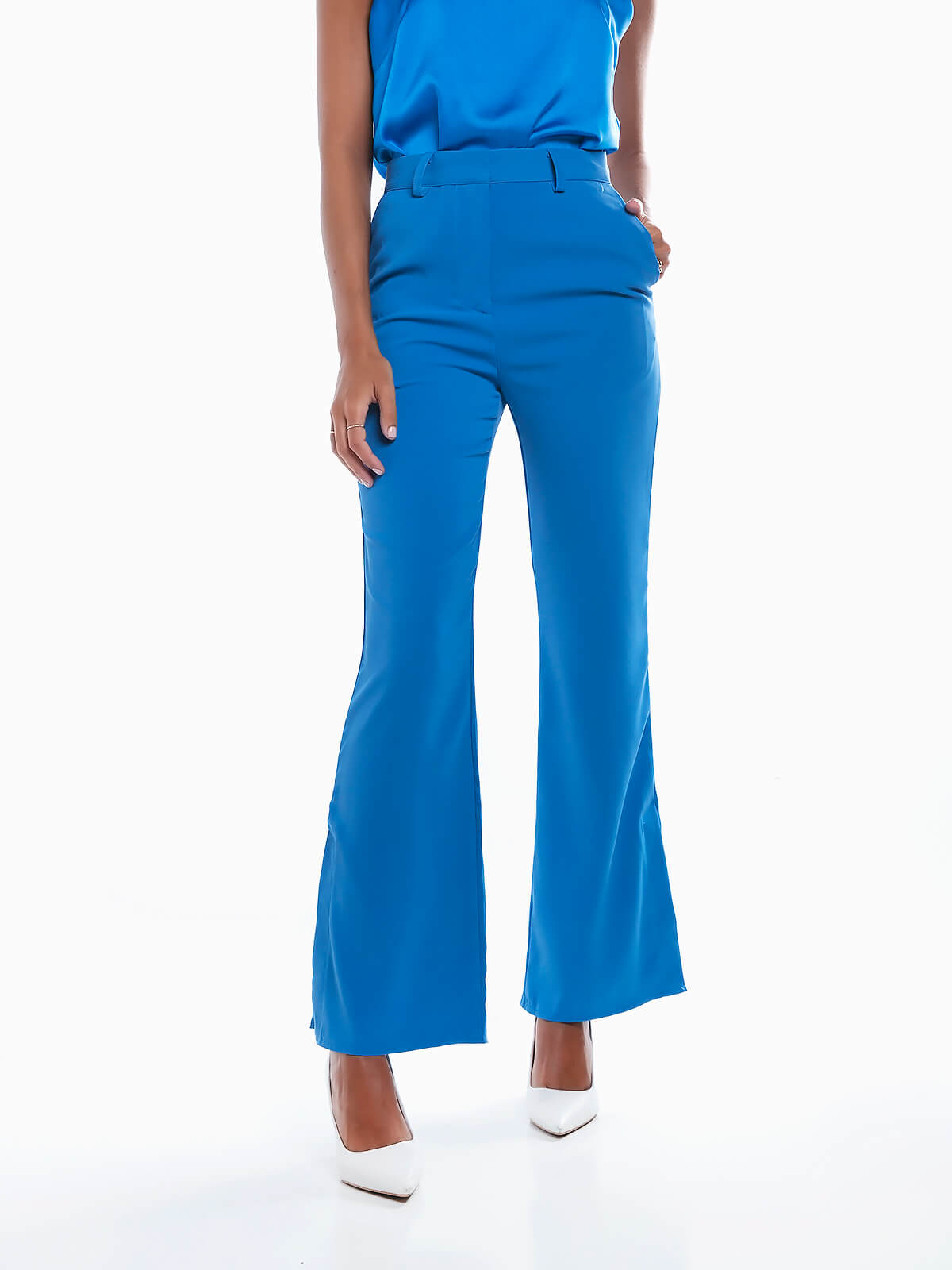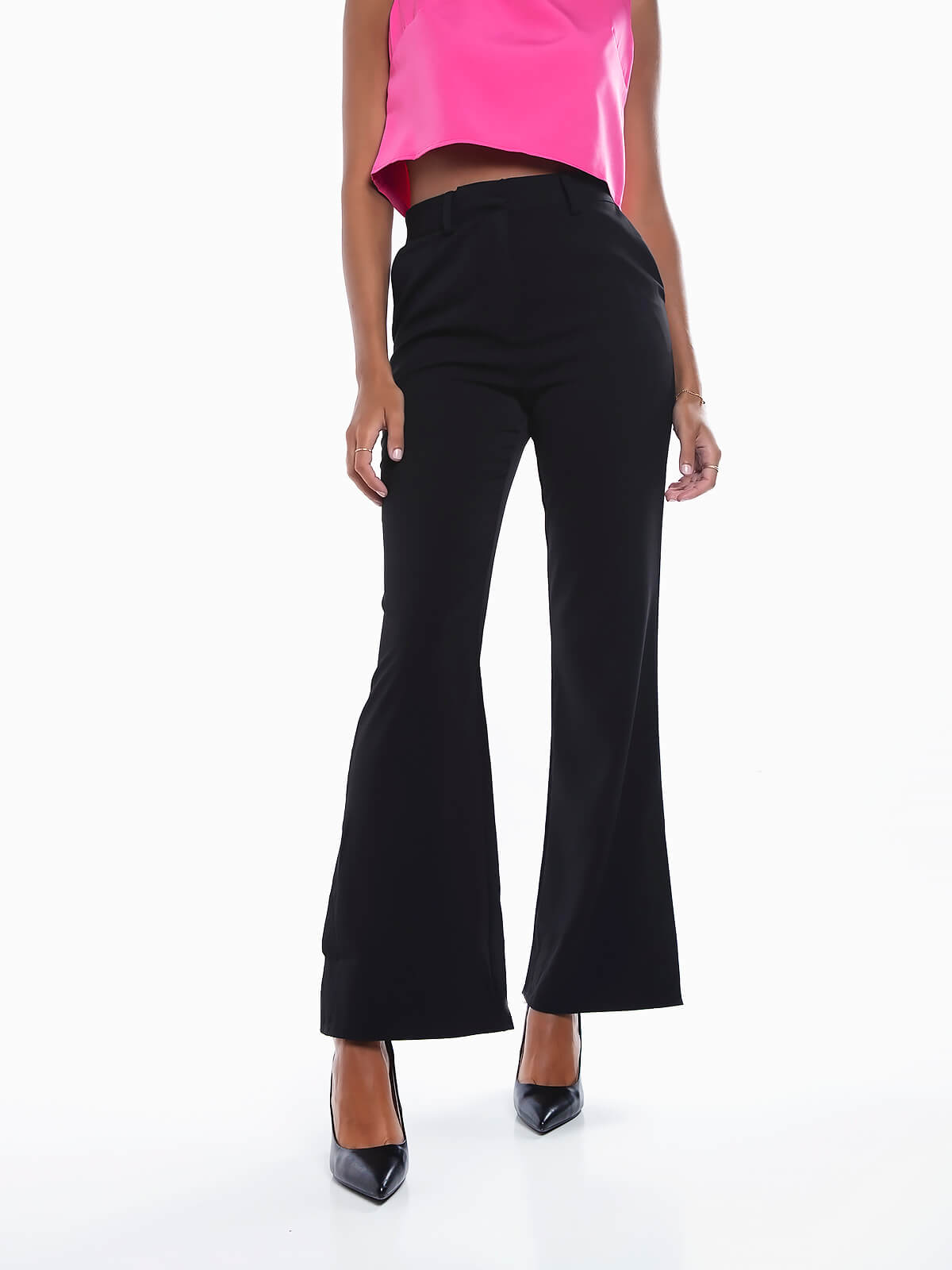 Calças à boca de sino com aberturas laterais na base. Calças de cintura alta com 2 bolsos laterais. Bolsos falsos atrás. Aperto de fecho éclair e ganchos metálicos.