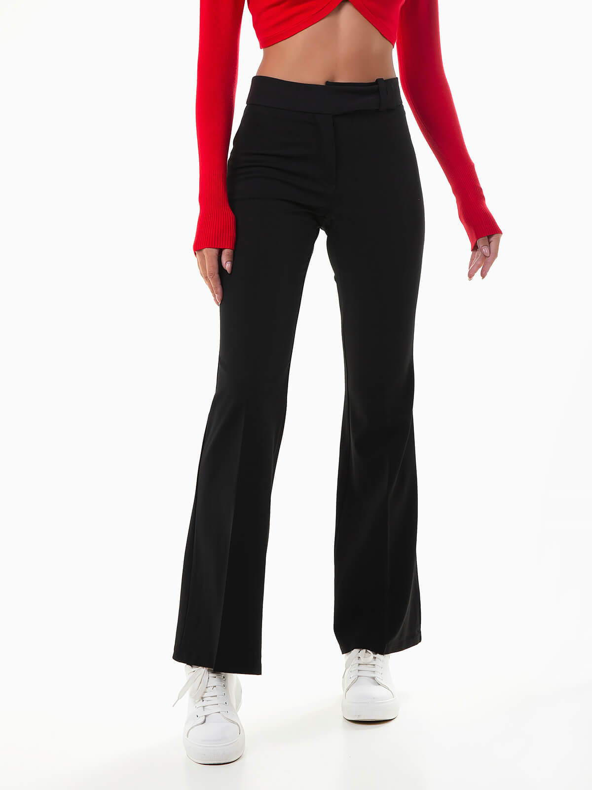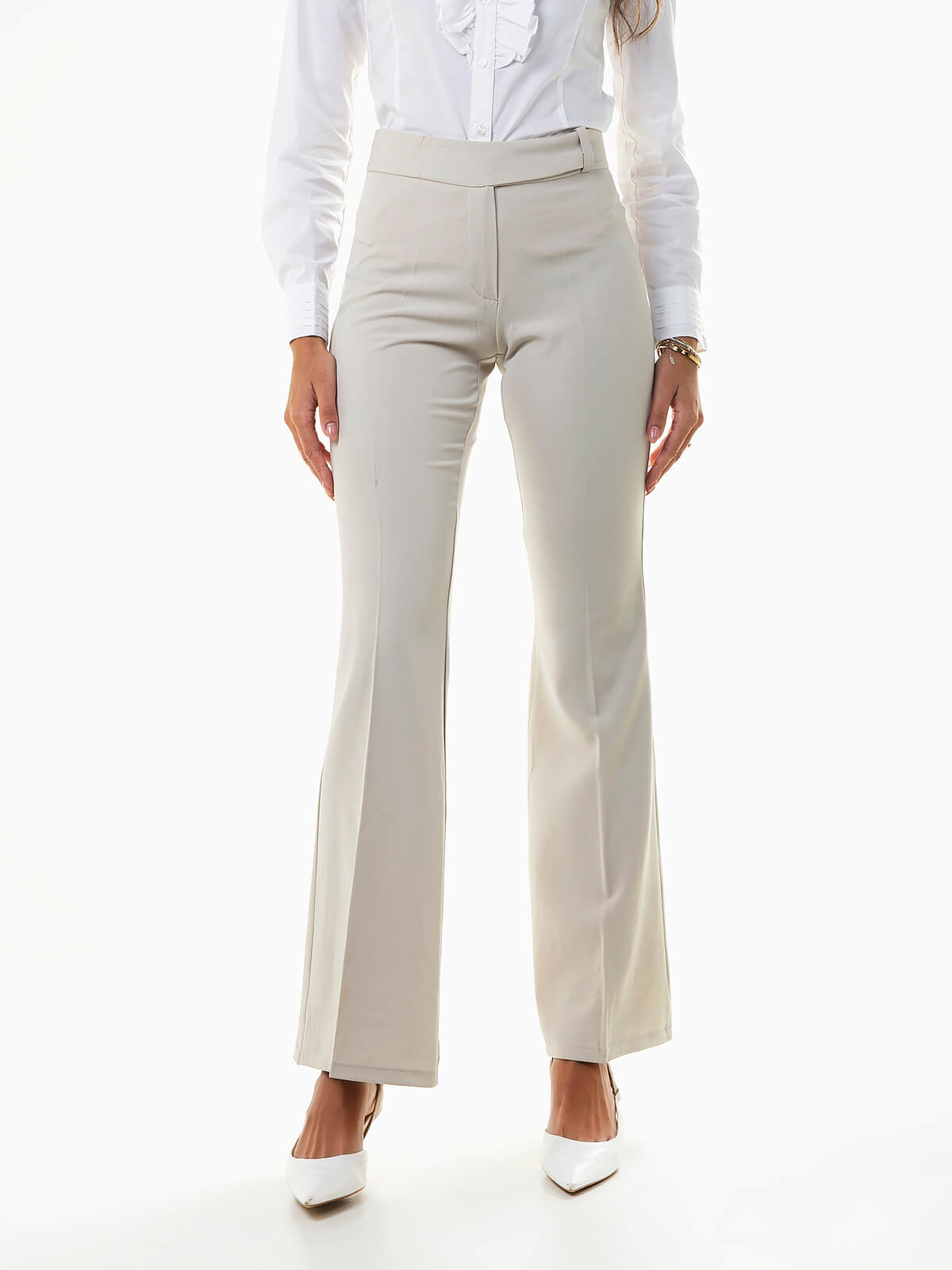 Calças à boca de sino com pormenor de pinças à frente. Calças elásticas de cintura alta com aperto de fecho éclair e 3 botões.