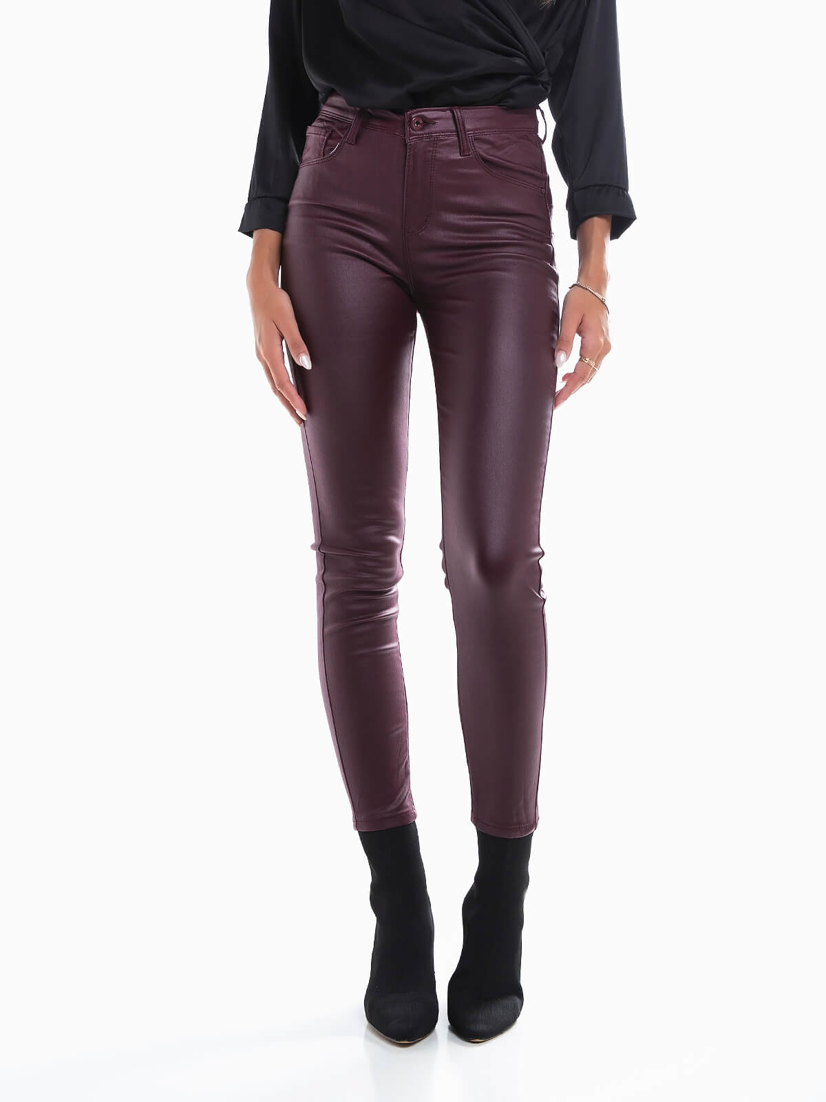 Calças bordeaux em pele sintética com efeito push-up para senhora. Calças skinny de cintura alta com interior cardado. 5 bolsos. Aperto de fecho éclair e botão.