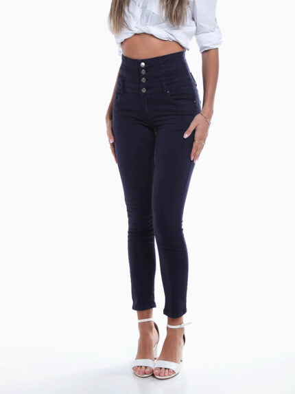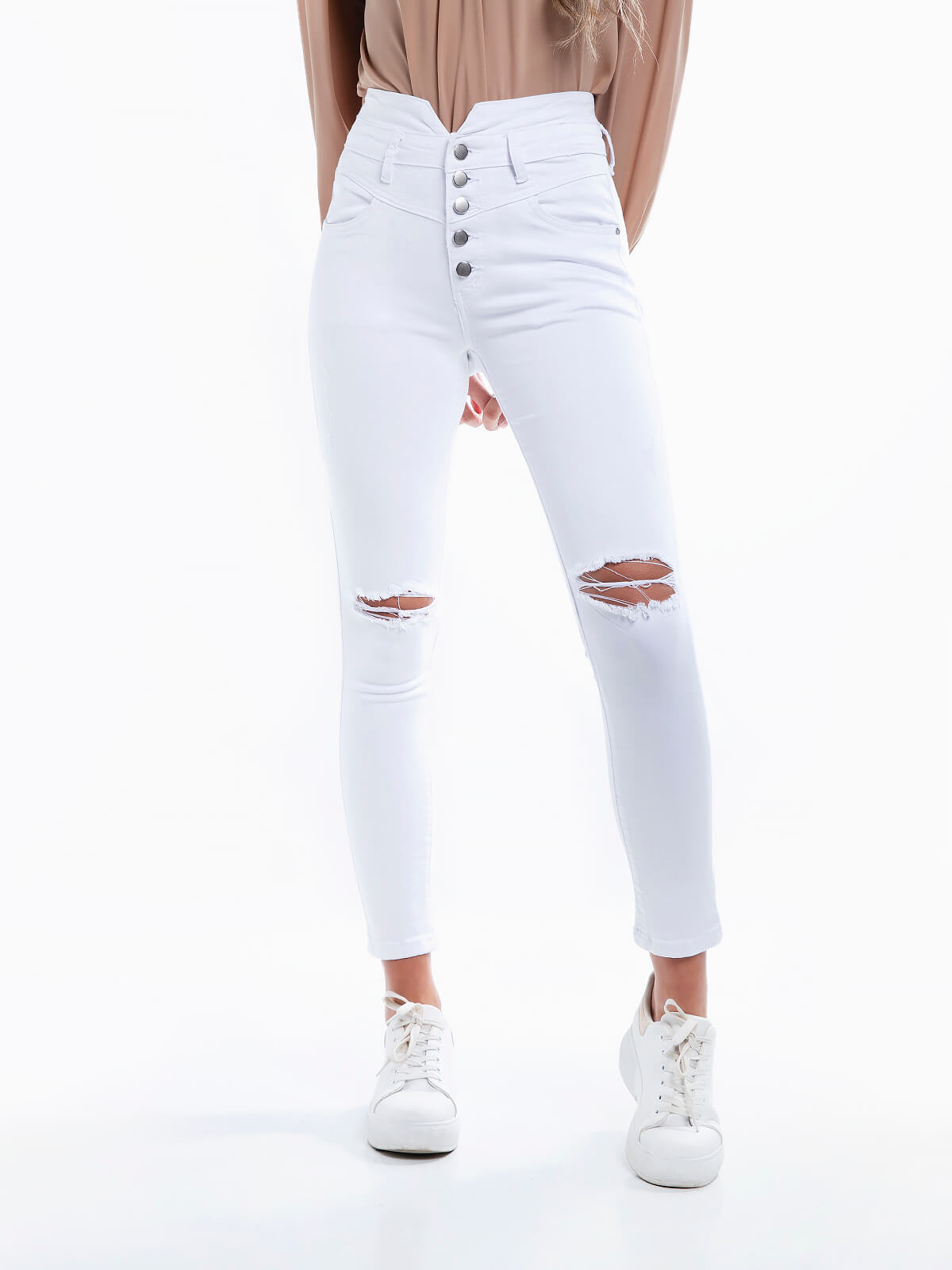 Calças brancas de ganga com efeito de rotos nos joelhos. Calças skinny de cintura alta com presilhas. Aperto de 5 botões. 4 bolsos.