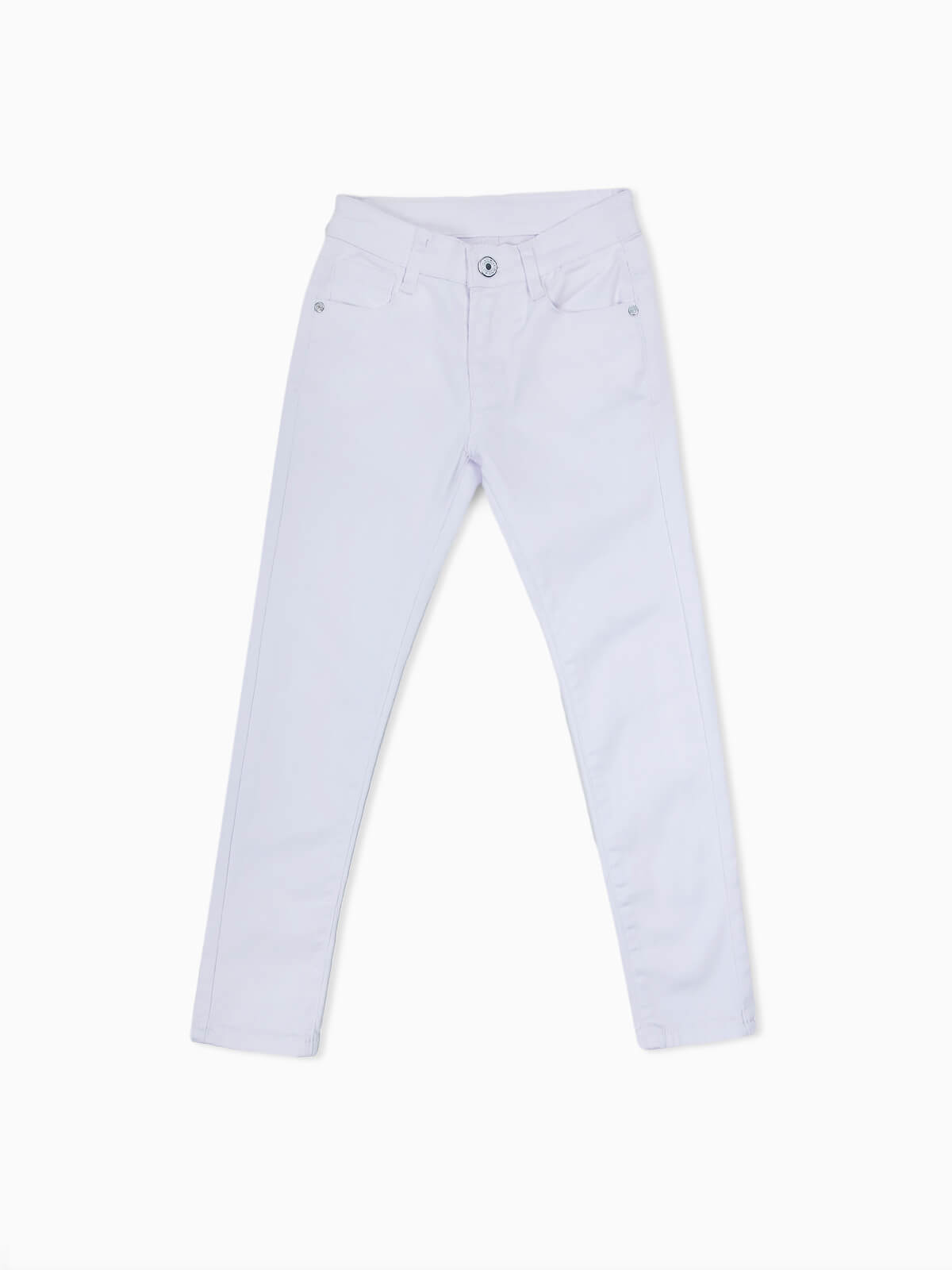 Calças brancas de sarja para menina. Calças de cintura elástica. 5 bolsos. Aperto de fecho éclair e botão.