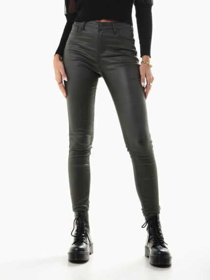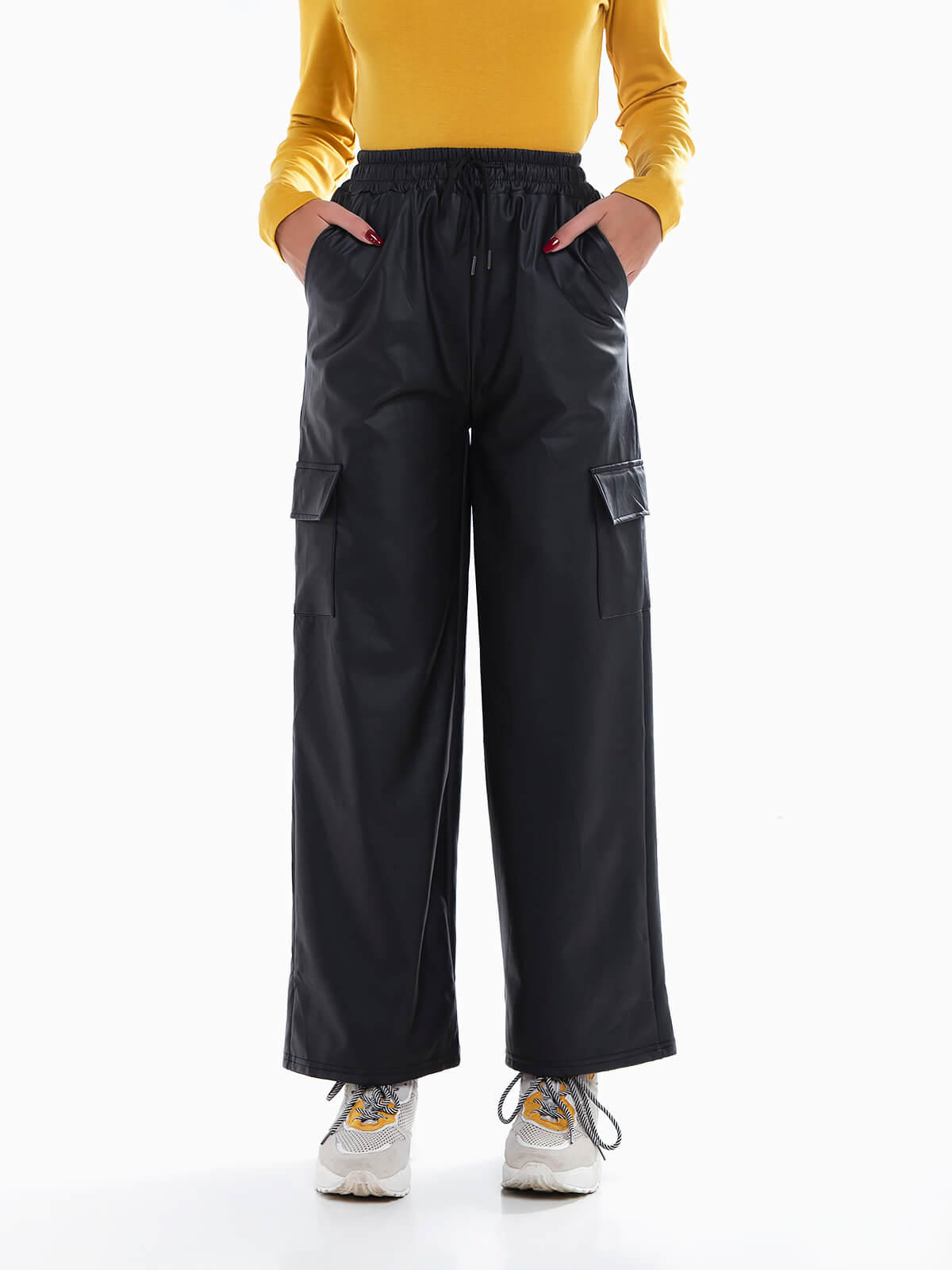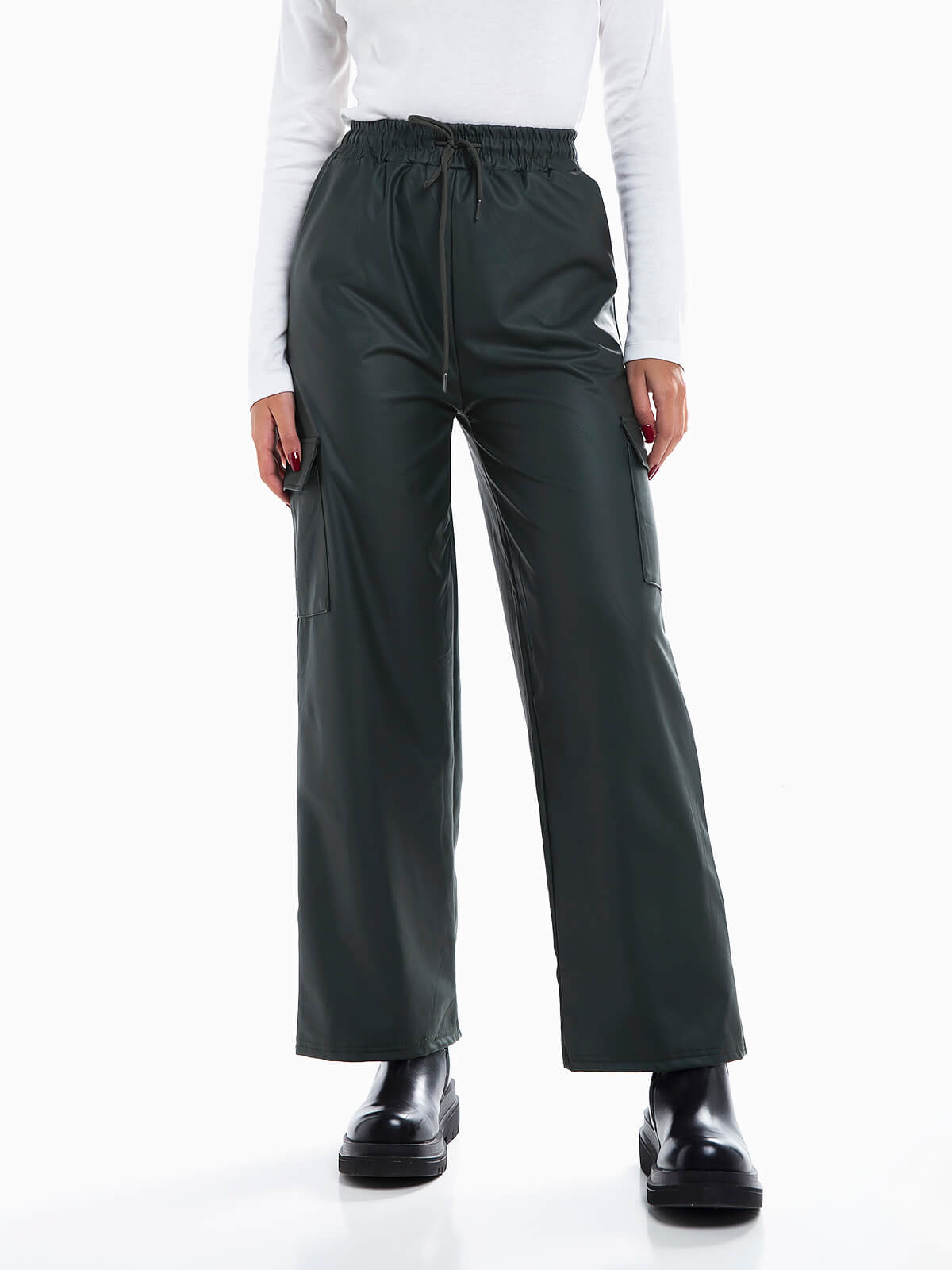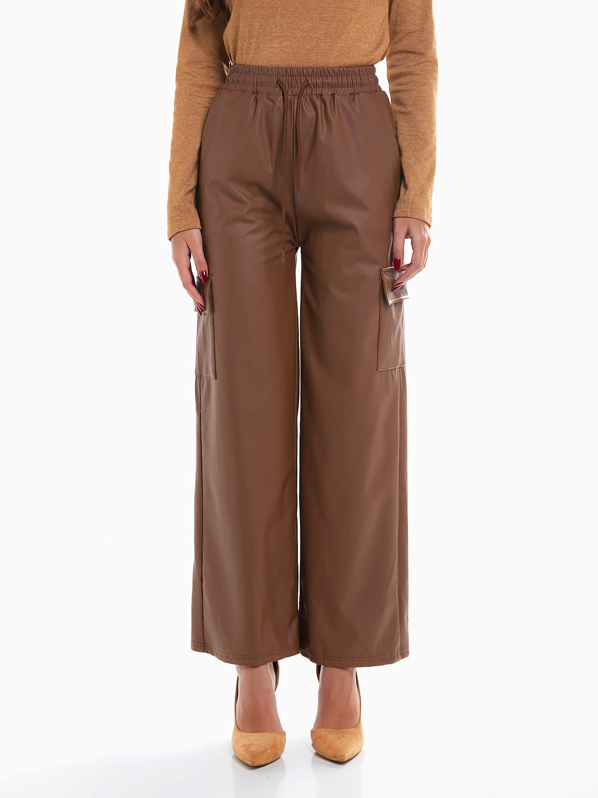 Calças cargo com efeito pele para senhora. Calças largas de cintura alta elástica com cordão para ajustar. Interior cardado. 4 bolsos.