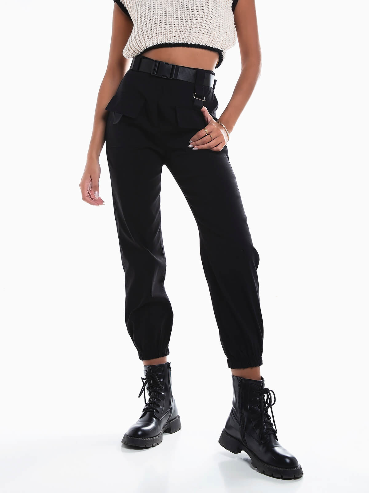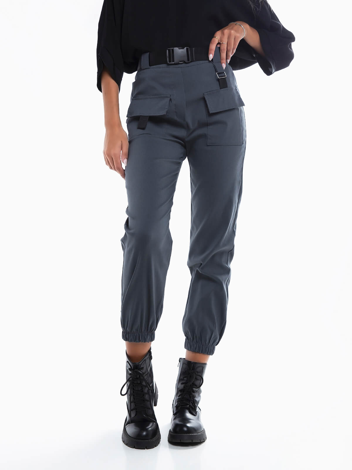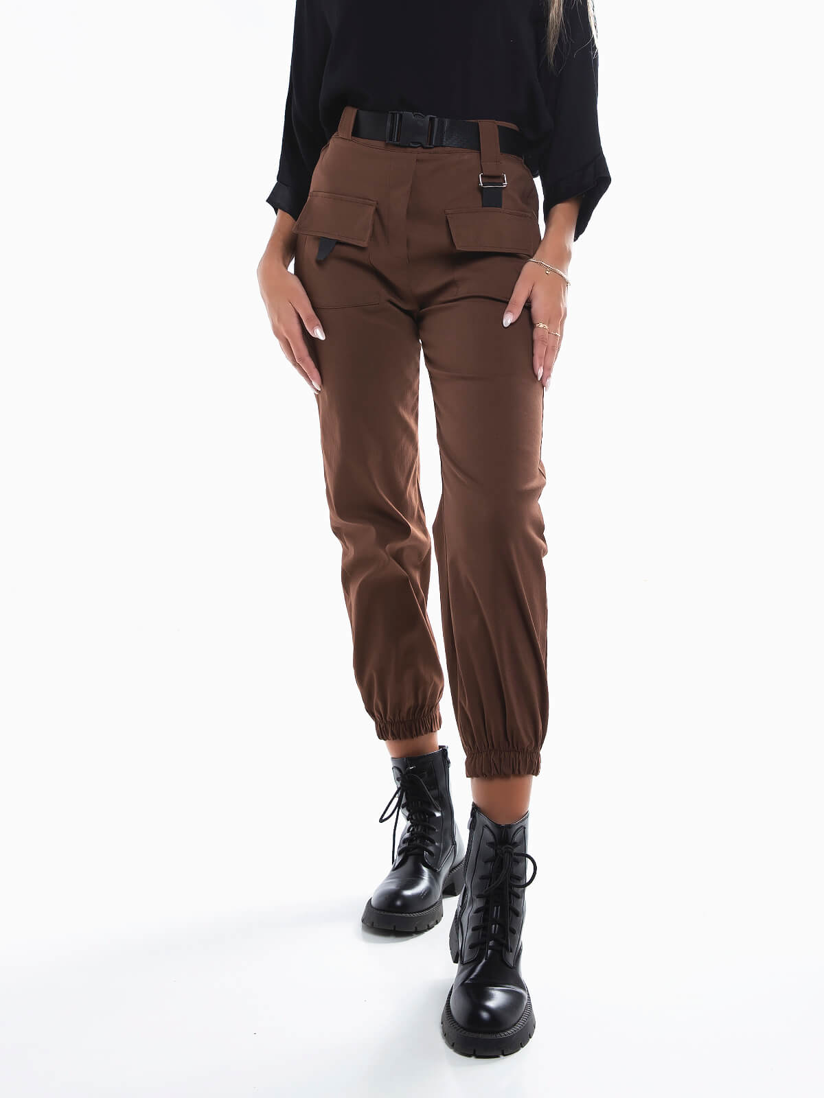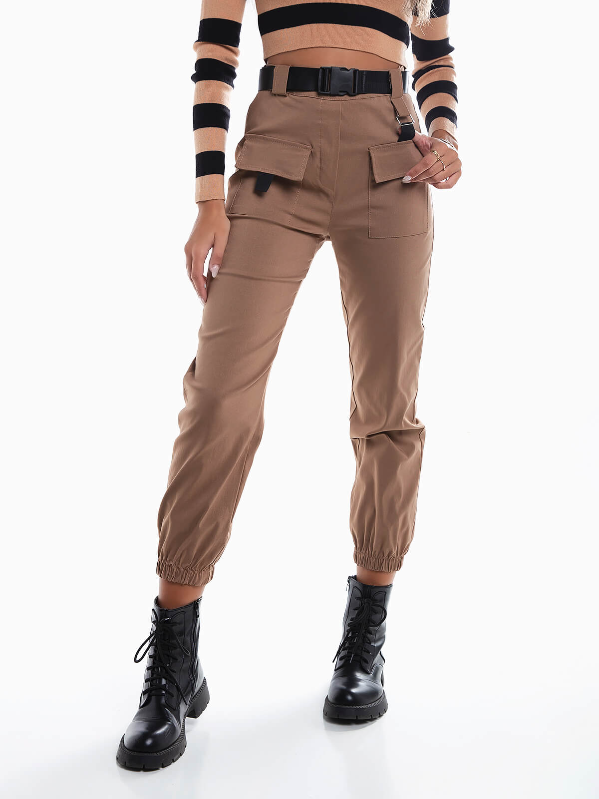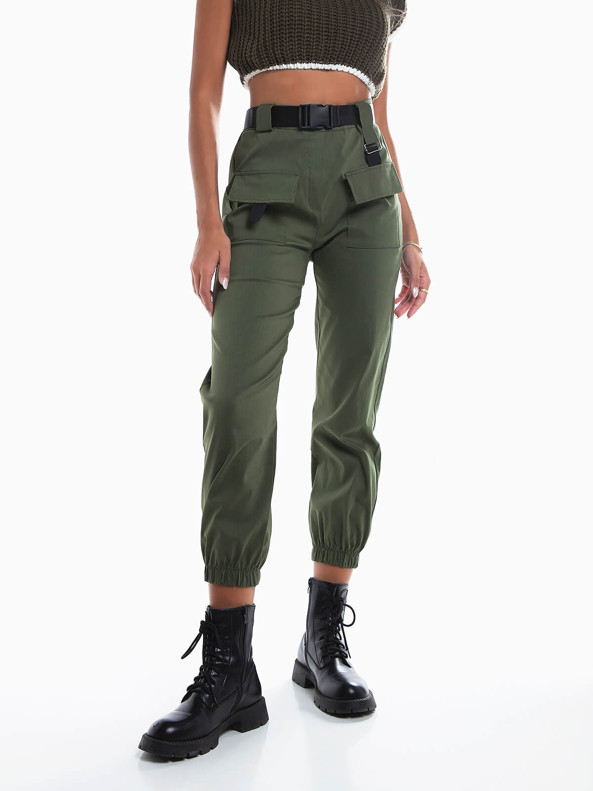 Calças cargo elásticas com cinto removível. Calças de cintura alta com 2 bolsos pala e pormenor de fivelas.