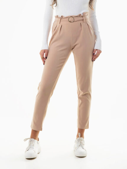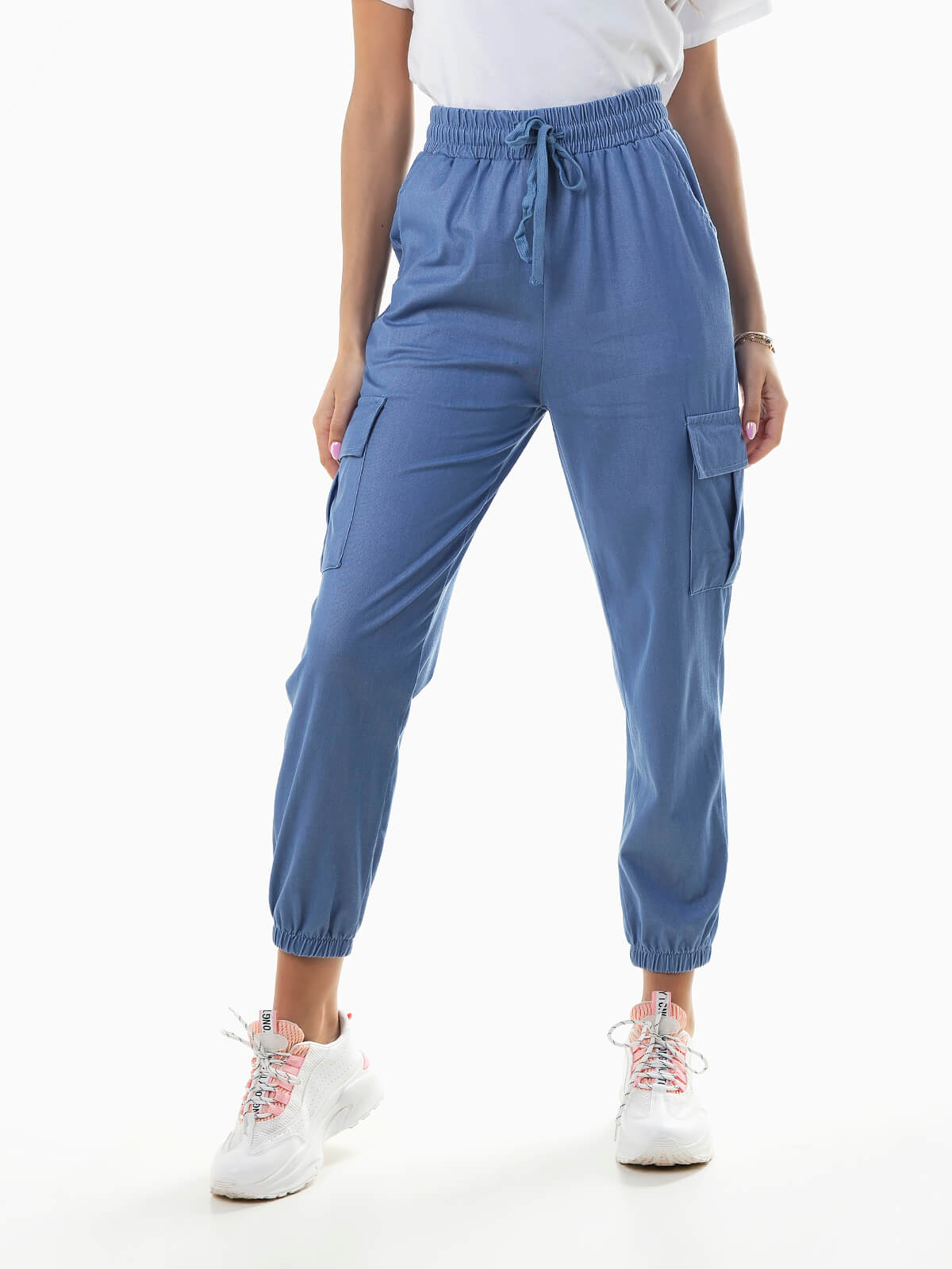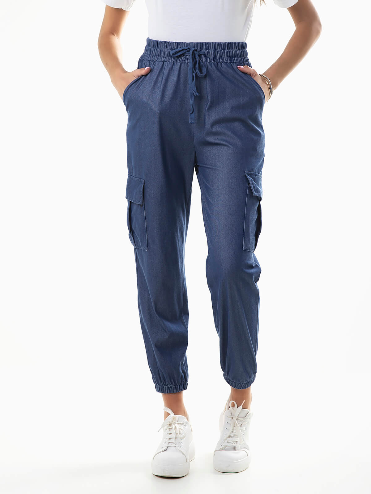 Calças cargo em tecido poliamida com aparência de ganga. Calças fluídas de cintura alta e punhos elásticos. Cordão para laço. 4 bolsos.
