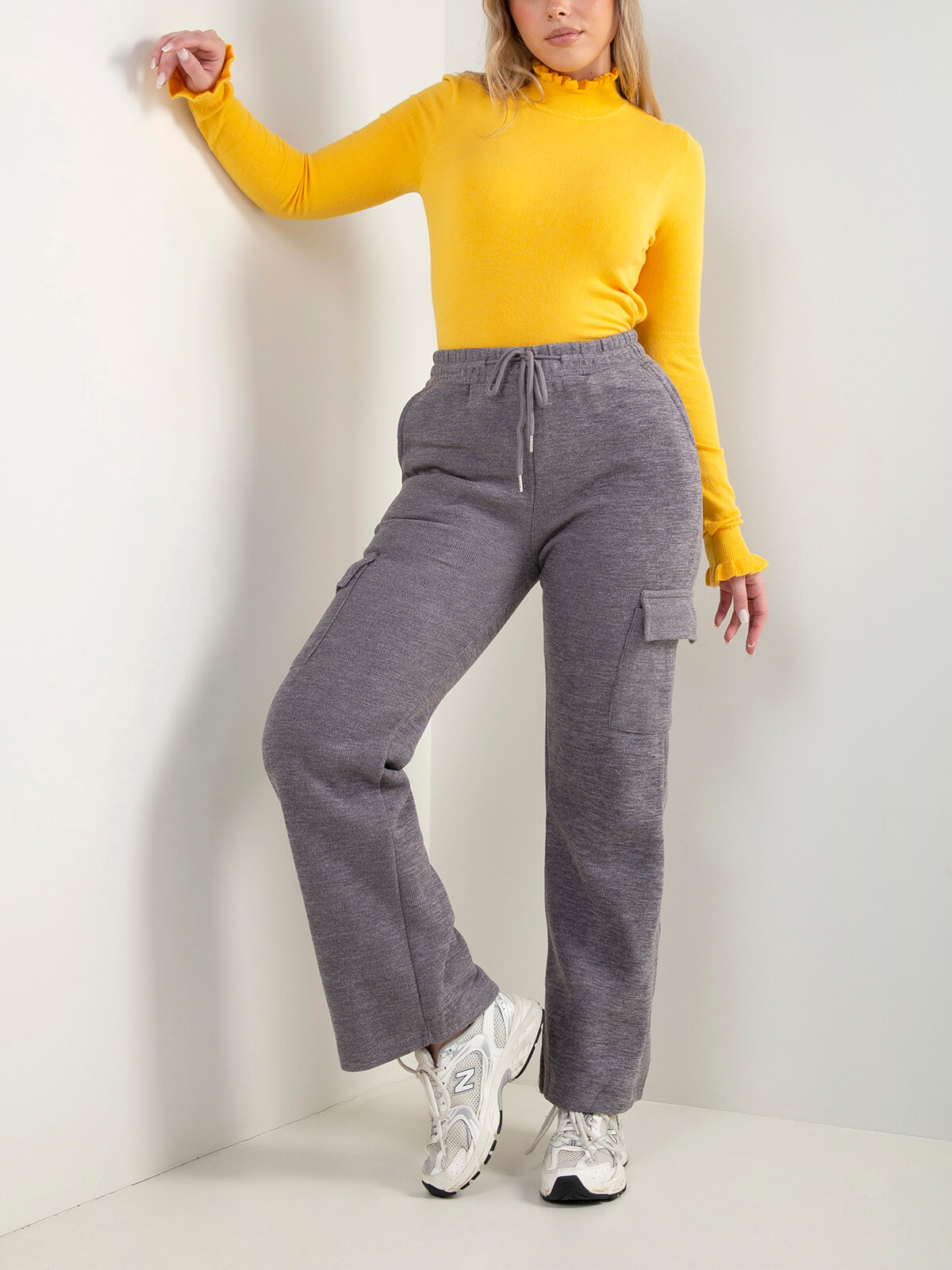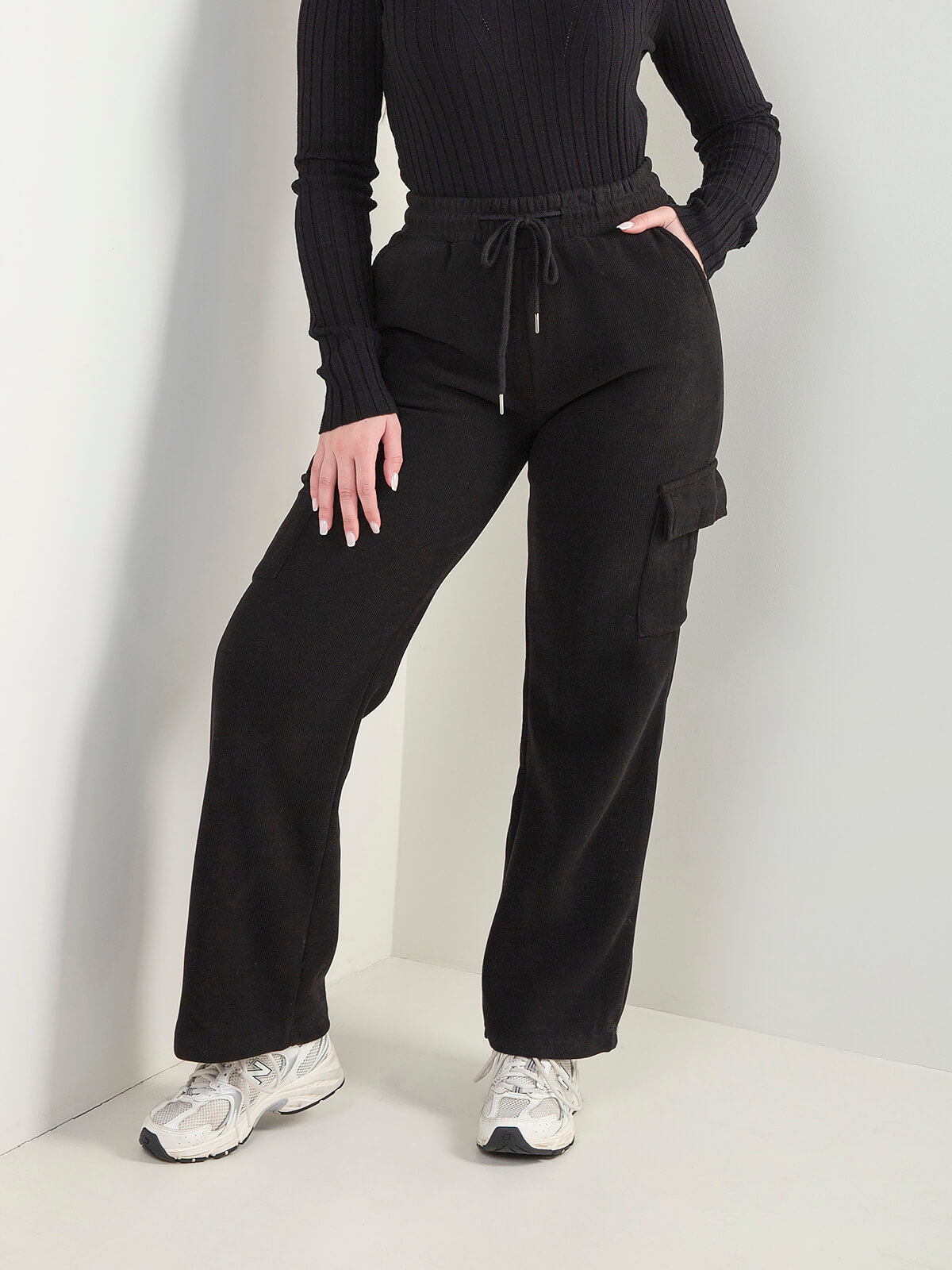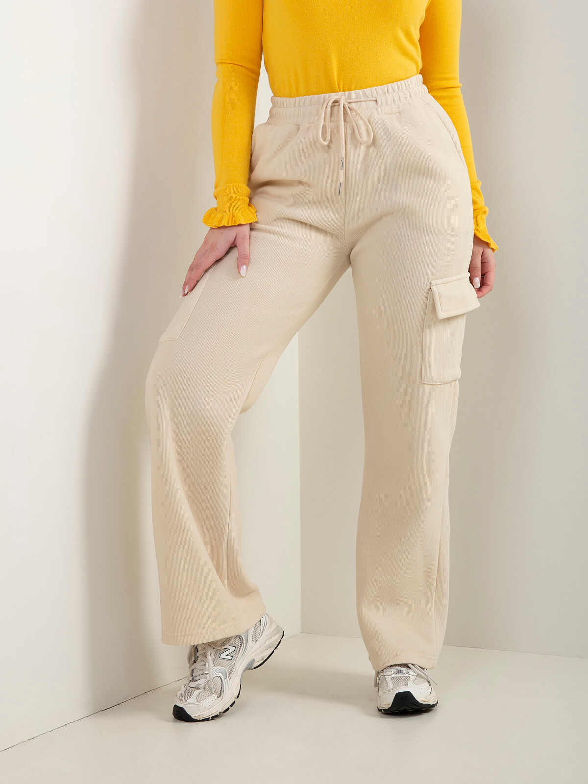 Calças cargo em malha com efeito bombazina, cintura alta com cordão e bolsos laterais. Modelo confortável, com perna larga interior cardado e toque macio, perfeitas para looks simples e atual.