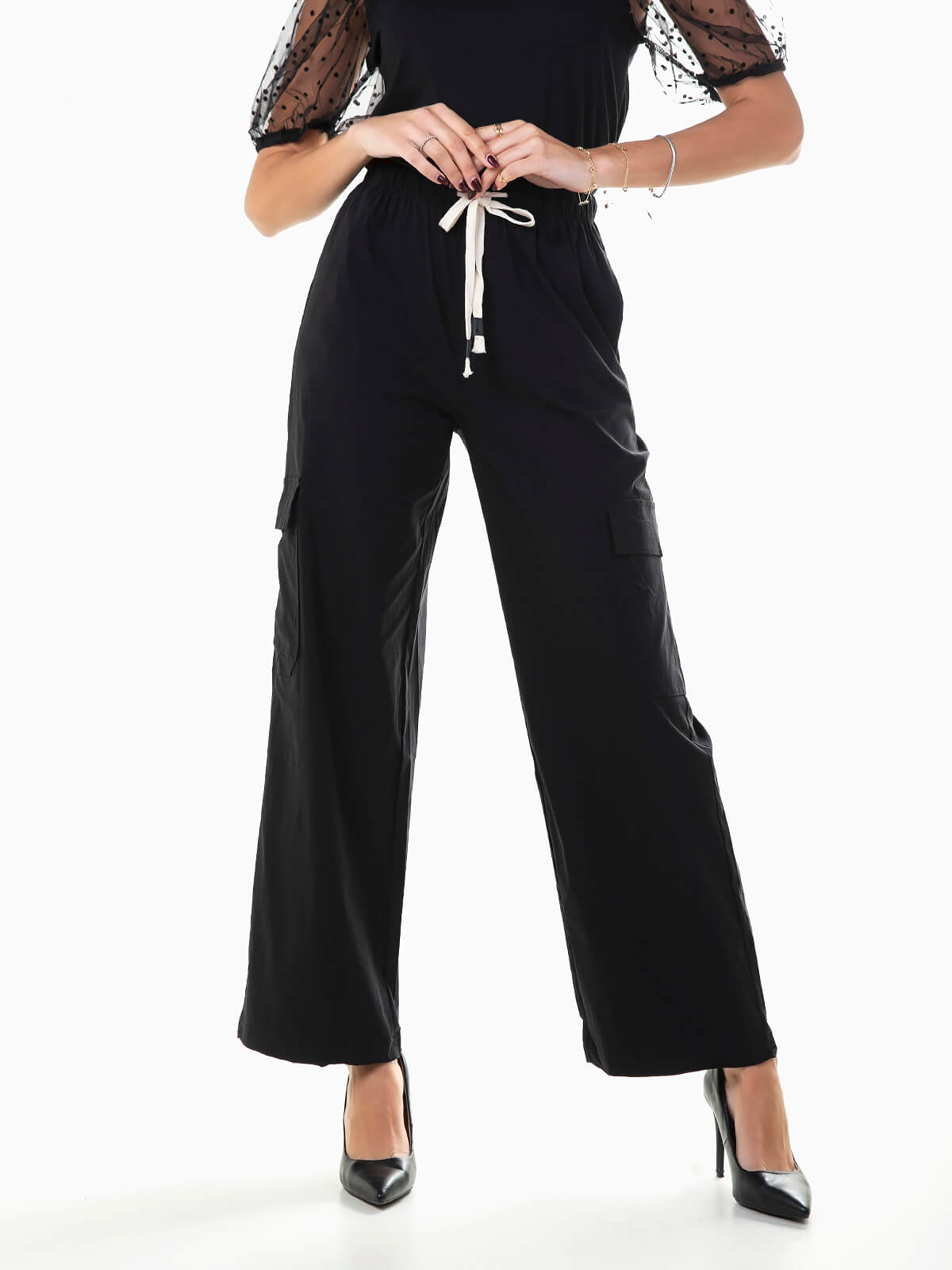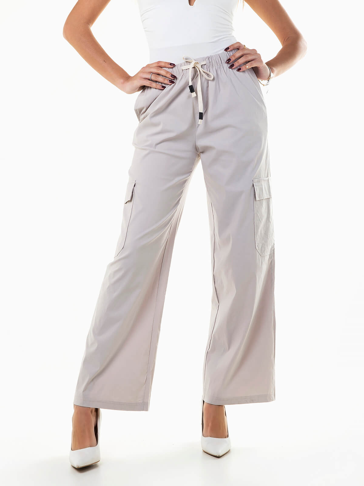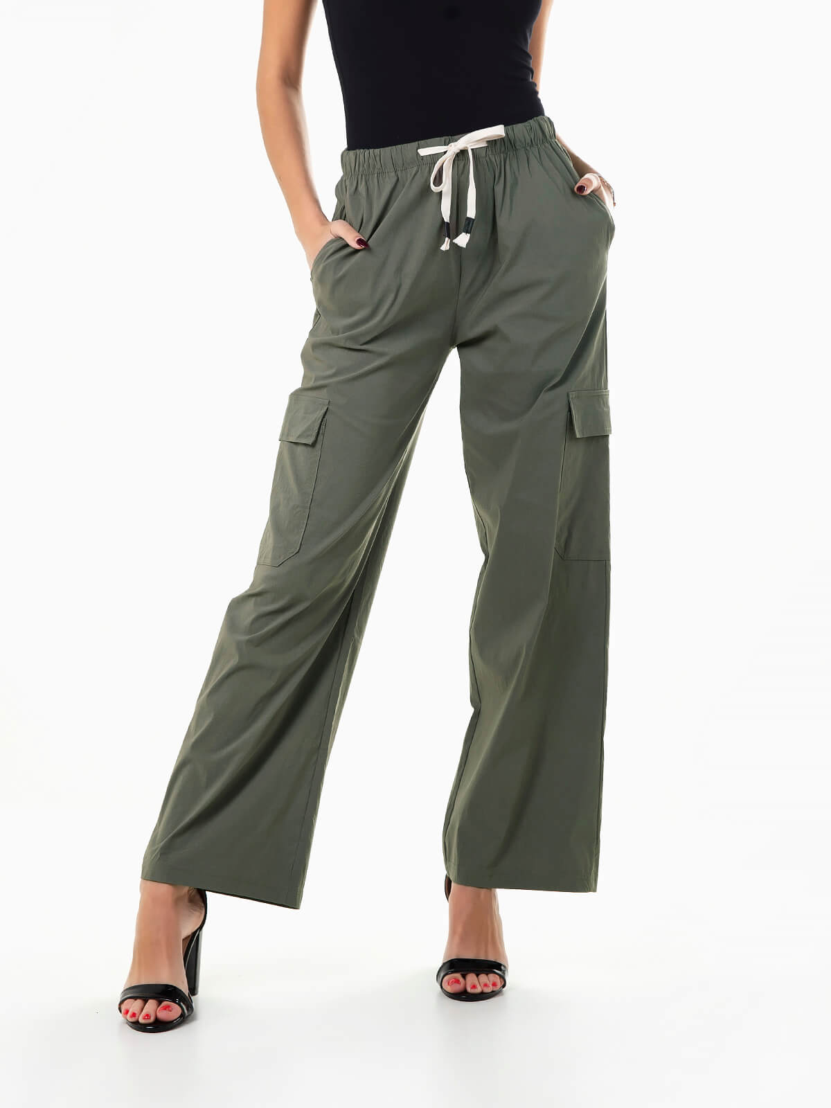 Calças cargo em tecido elástico com mistura de algodão para maior conforto e respirabilidade. Calças largas de cintura alta elástica com cordão para ajustar. 6 bolsos.