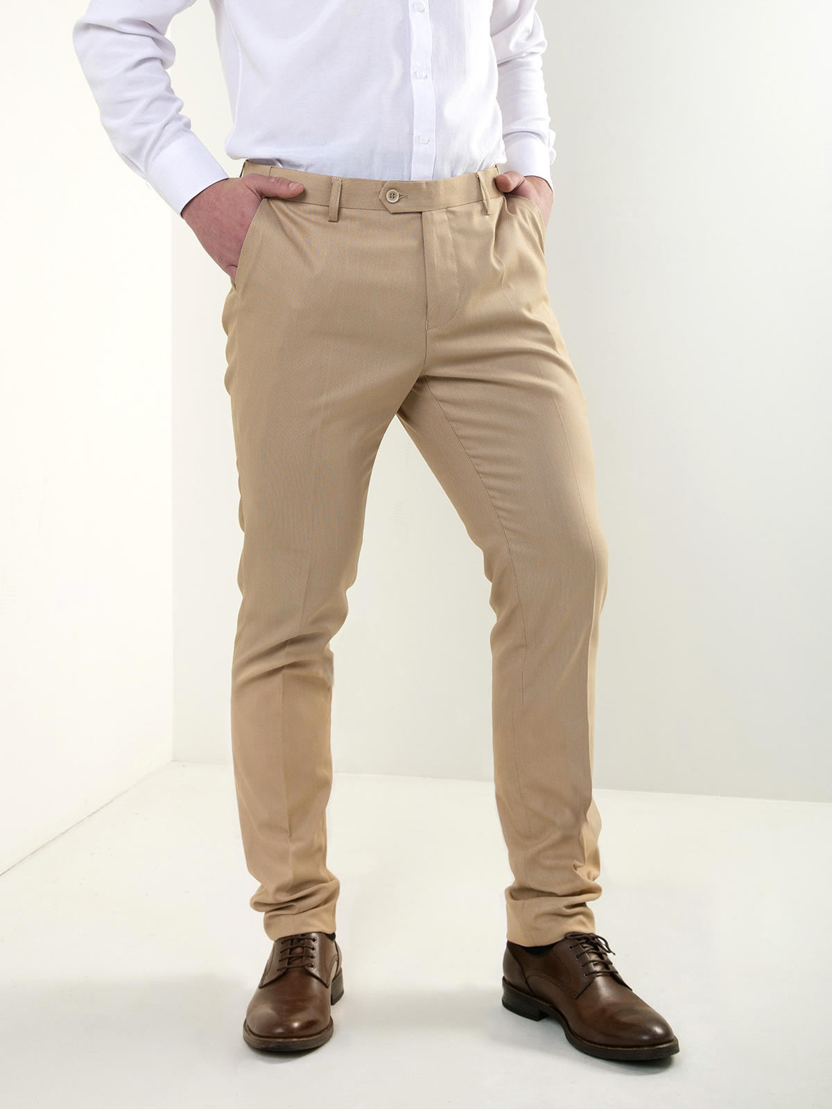 Calças chino bege com micro padrão, bolsos laterais e fecho com botão e fecho éclair. Modelo com elástico interior na cintura para melhor ajuste.