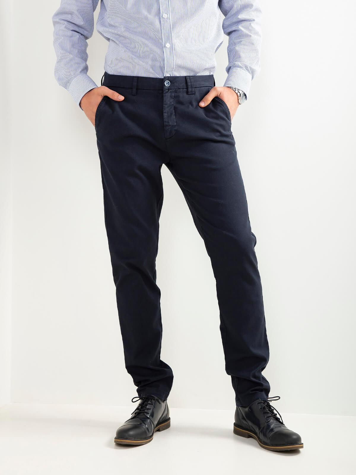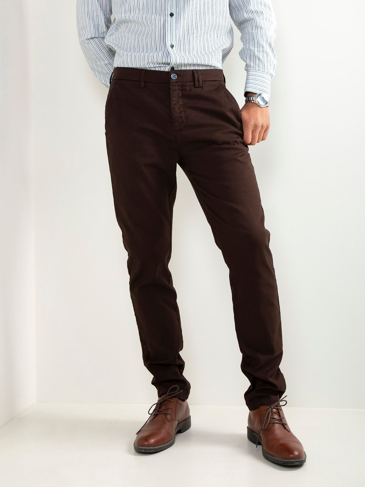 Calças chino num modelo confortável e versátil para o dia a dia. Têm cintura média, bolsos laterais, bolsos traseiros com botão e fecho clássico de botão e zíper.