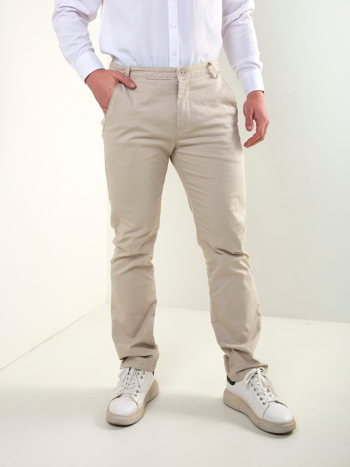 Calças chino de homem com bolsos laterais e bolsos traseiros com botão. Modelo confortável com fecho frontal, micropadrão e presilhas para cinto, ideal para looks formais ou smart casual.