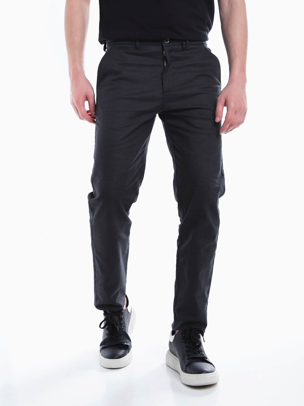 Calças chino pretas para homem. Calças clássicas slim fit. Dois bolsos laterais e dois posteriores com abertura debruada. Aperto de fecho éclair e botão.