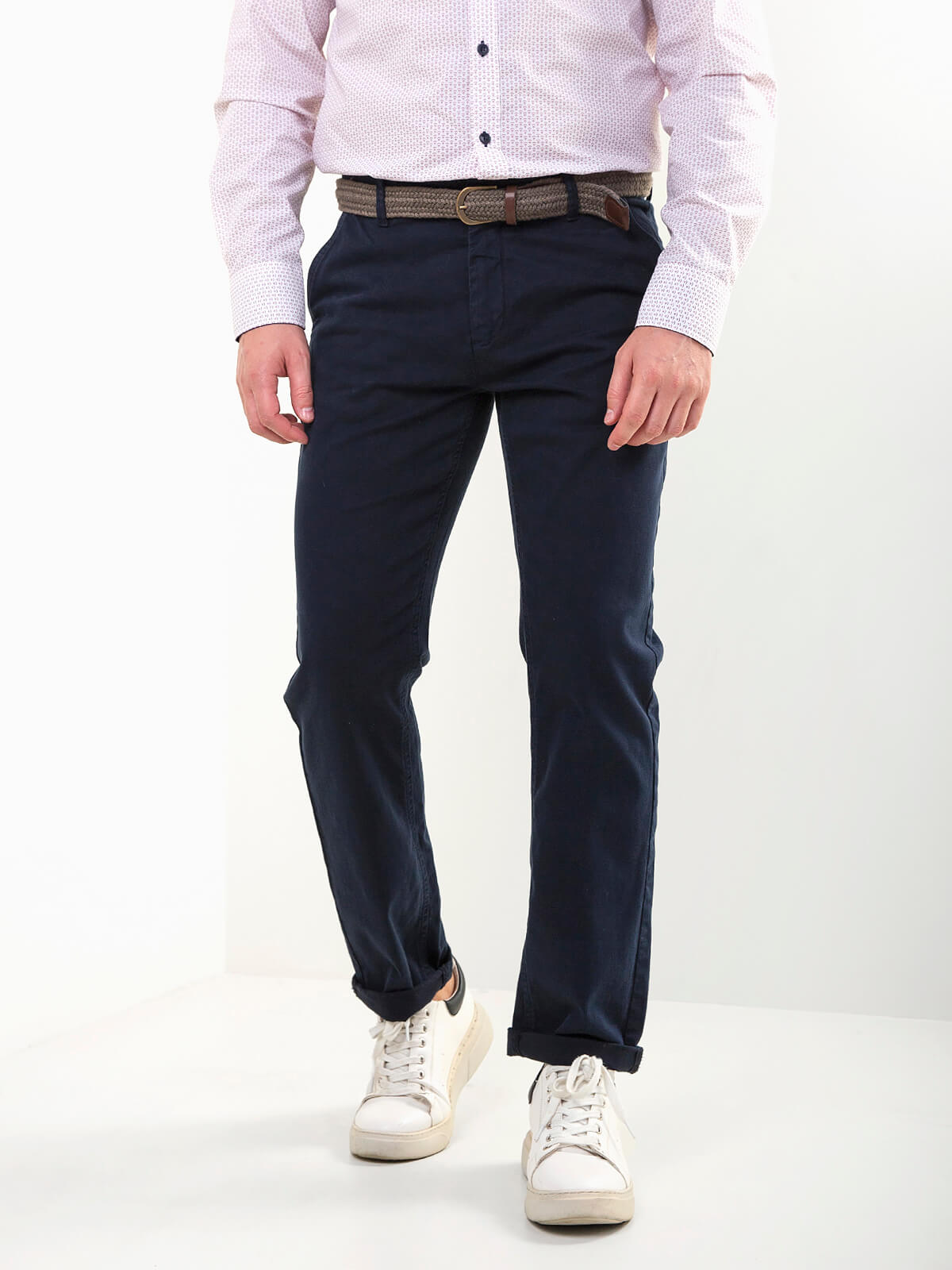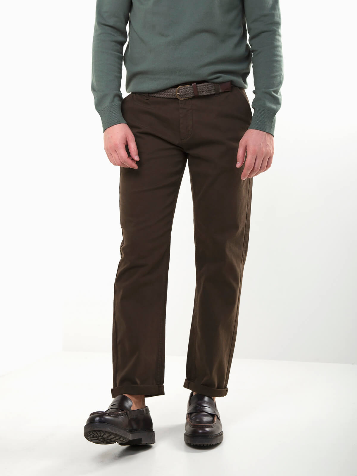 Calças chino em sarja de algodãoo, com cinto entrançado. Modelo clássico e confortável com 4 bolsos. Um básico versátil para o dia a dia, fácil de combinar com camisolas, polos ou camisas.