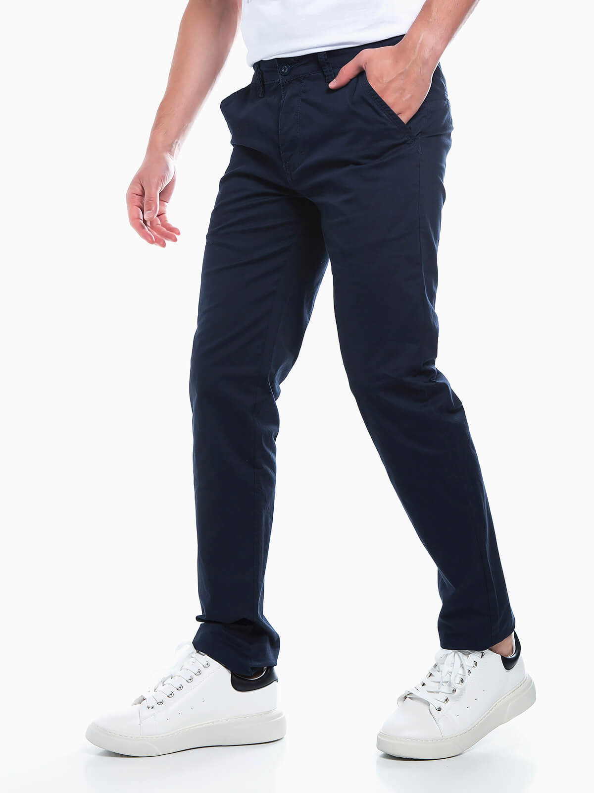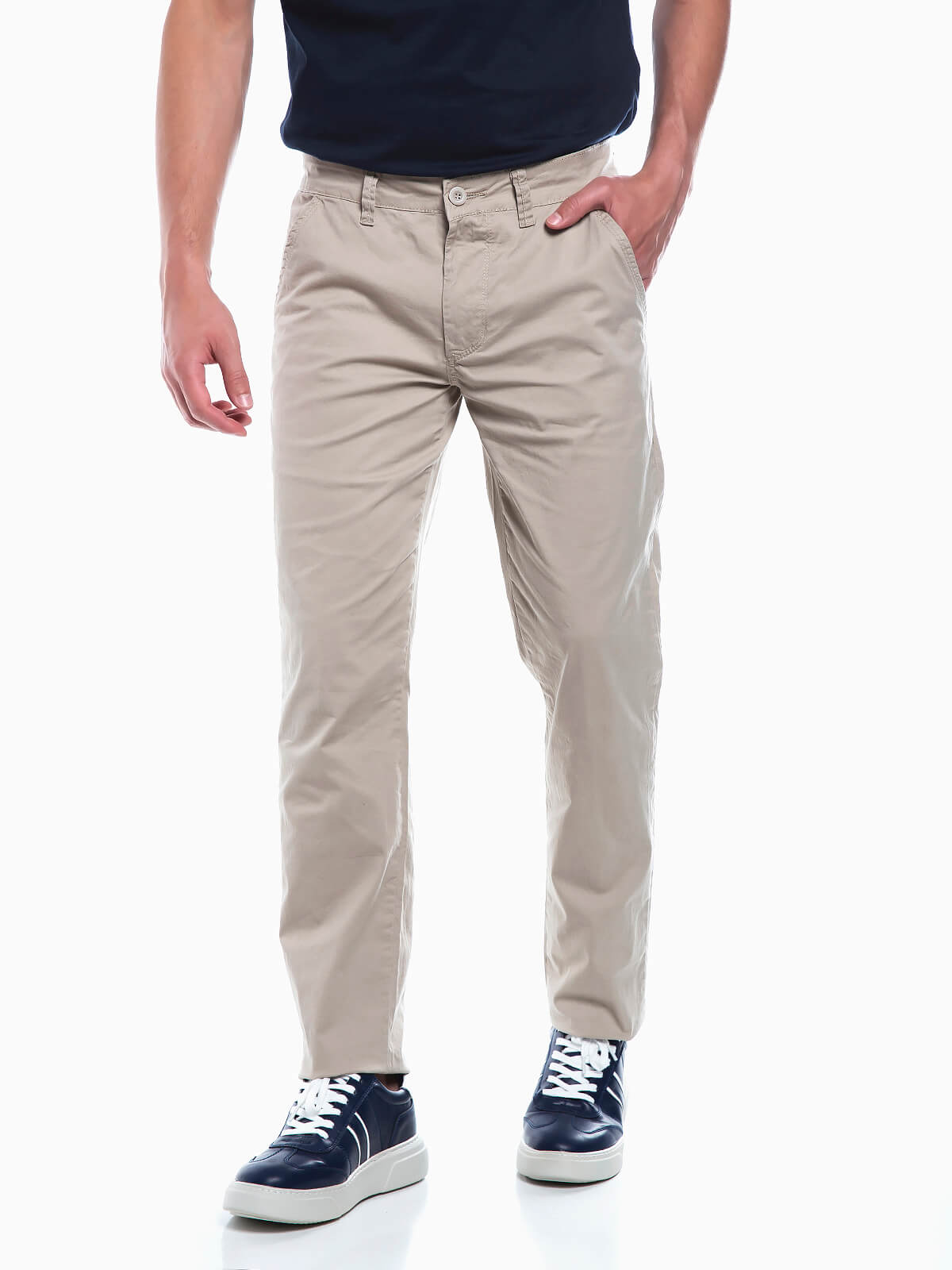 Calças chino sarja slim fit. Calças chino homem com bolsos laterais e atrás com botão. Aperto de fecho éclair e botão.