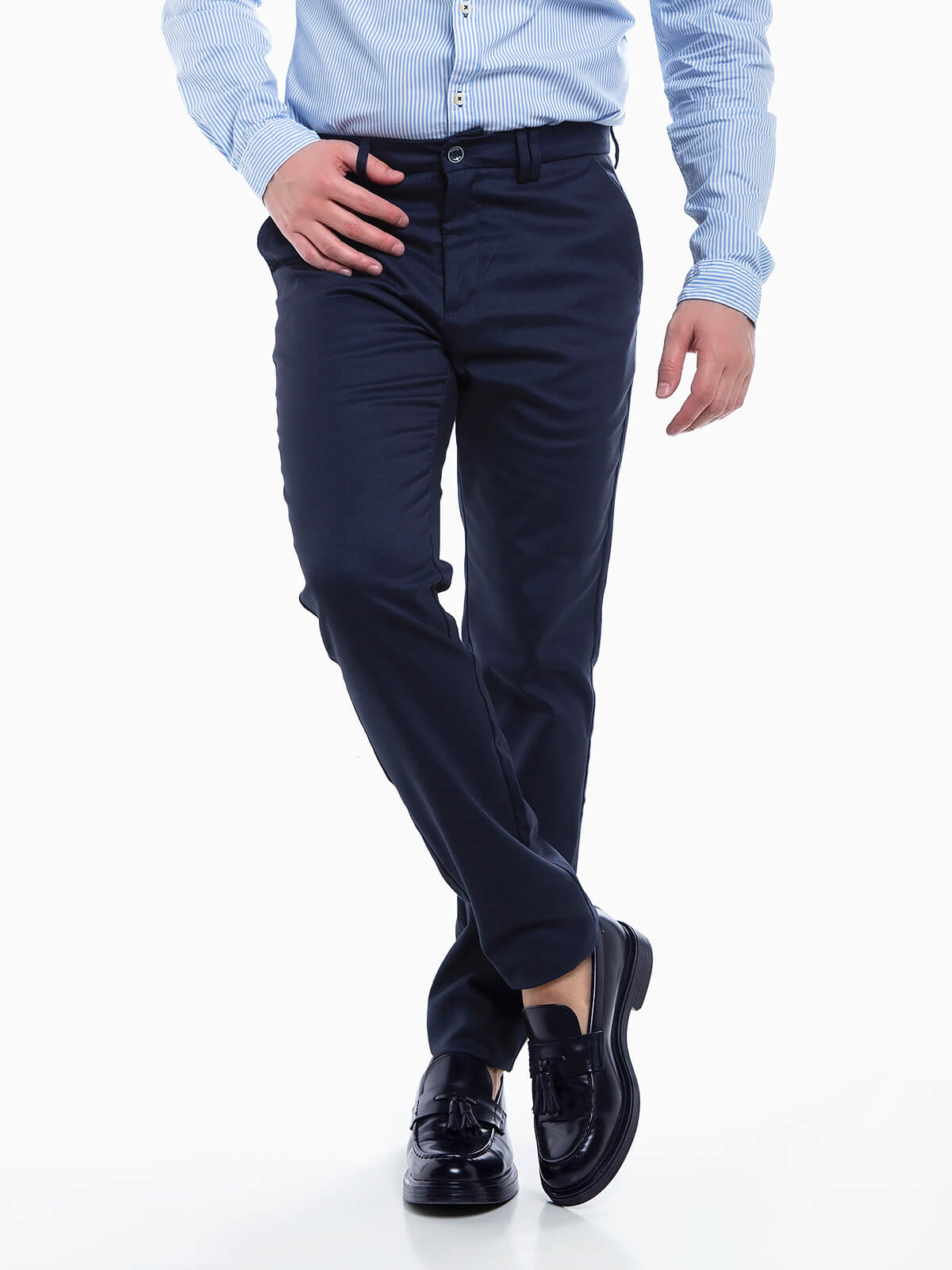 Calças chino azul marinho para homem. Calças clássicas slim fit. Dois bolsos laterais e dois posteriores com abertura debruada. Aperto de fecho éclair e botão.