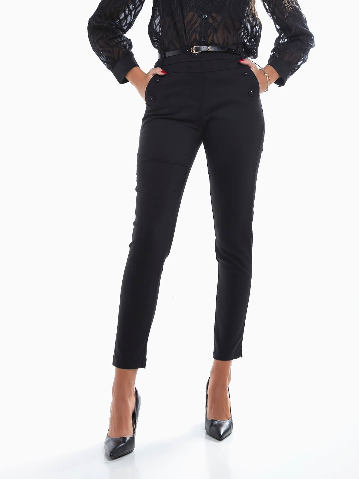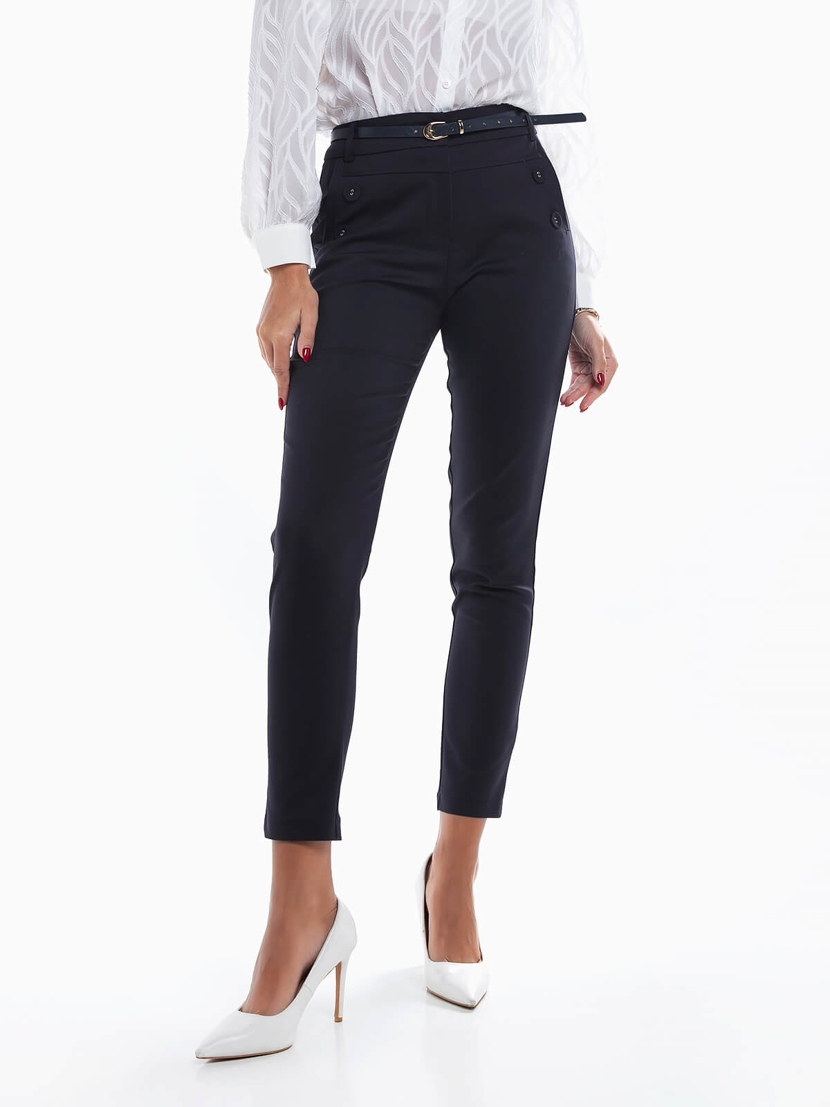 Calças de cintura alta com cinto em pele sintética removível. Calças elásticas com botões decorativos. 2 bolsos. Aperto de fecho éclair e botão.